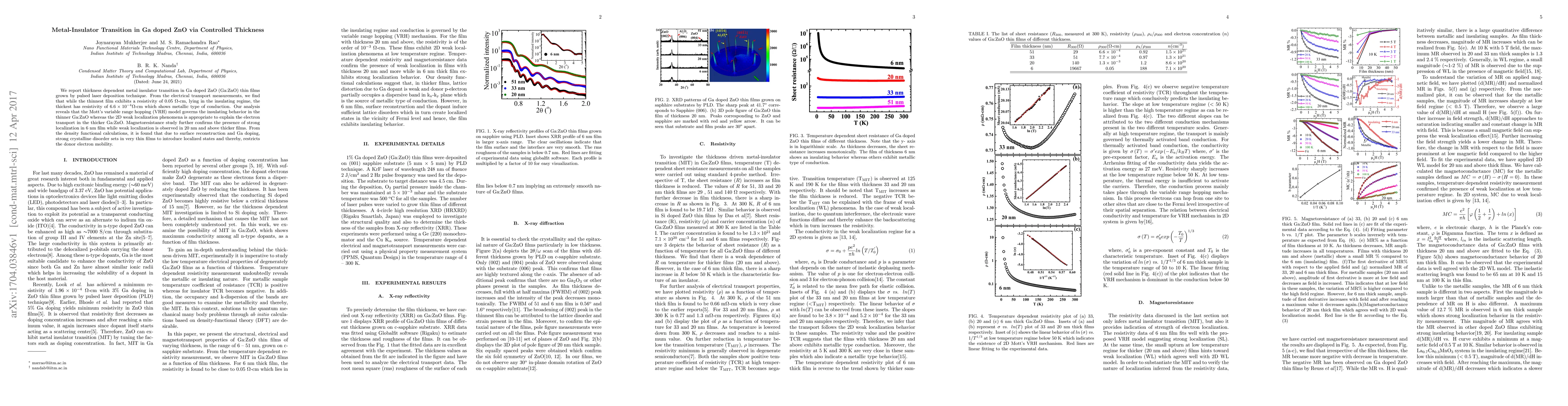 Research shows that Ga doped ZnO thin films exhibit metal-insulator transition based on film thickness, with thinner films behaving like insulators due to strong localization and thicker films showing metallic conduction via weak localization.