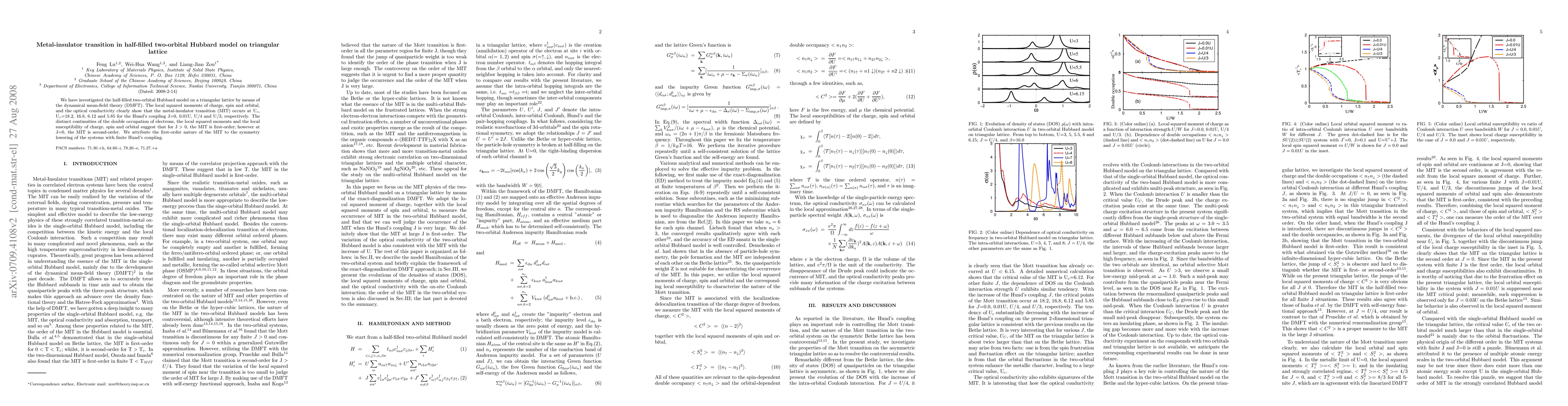 This paper investigates the metal-insulator transition in a half-filled two-orbital Hubbard model on a triangular lattice using DMFT, finding a transition at varying critical interaction strengths Uc. The transition is first-order for non-zero Hund's coupling and second-order at zero coupling, attributed to the low symmetry of the system.