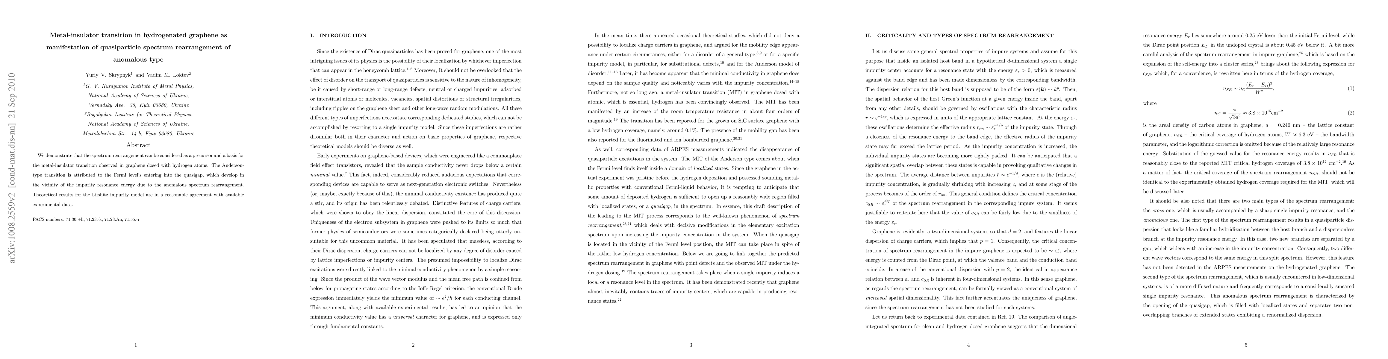 The research reveals that hydrogen-doped graphene exhibits a metal-insulator transition, triggered by spectrum rearrangement akin to an anomalous Anderson-type transition. This transition is linked to the Fermi level aligning with a mobility edge, influenced by the hydrogen atoms, supported by comparisons to Lifshitz impurity model theoretical results.