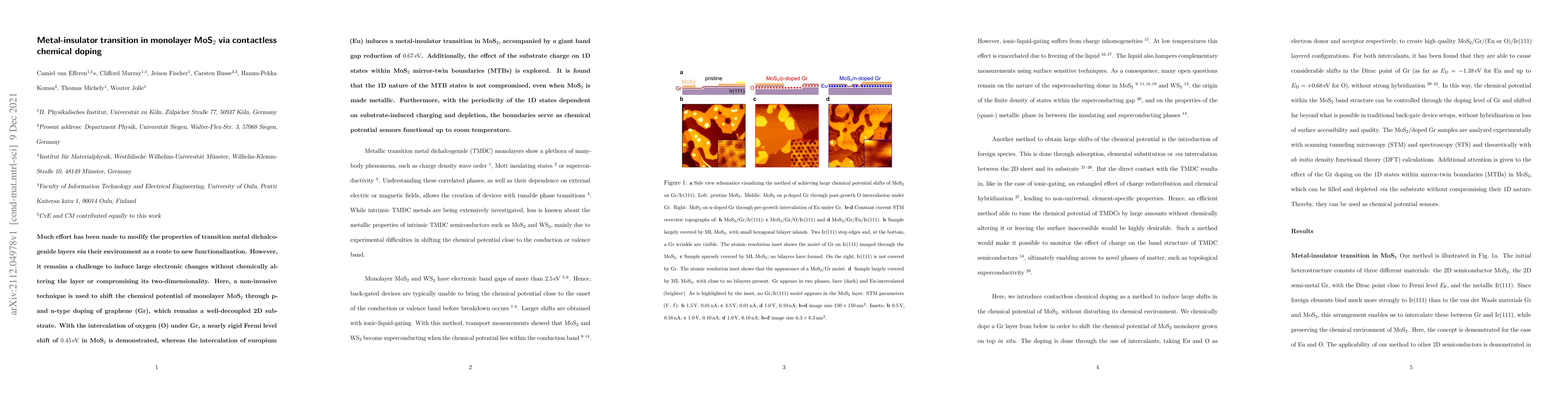 This study demonstrates a contactless chemical doping method to induce a metal-insulator transition in monolayer MoS$_2$ via graphene substrate intercalation, achieving a significant Fermi level shift and preserving the 1D states within MoS$_2$ mirror-twin boundaries as functional sensors.