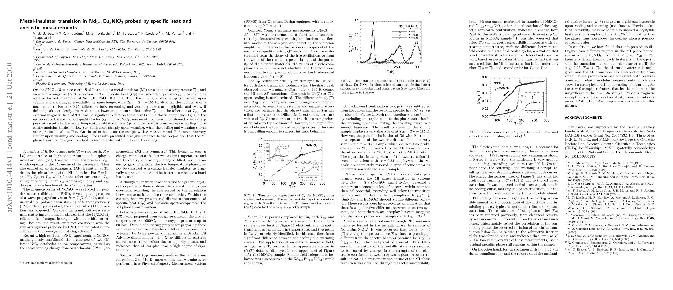 Researchers investigated metal-insulator transitions in Nd1-xEuxNiO3 using specific heat and anelastic measurements, finding that the transition changes from first to second order with increasing Eu doping as temperature peaks shift.