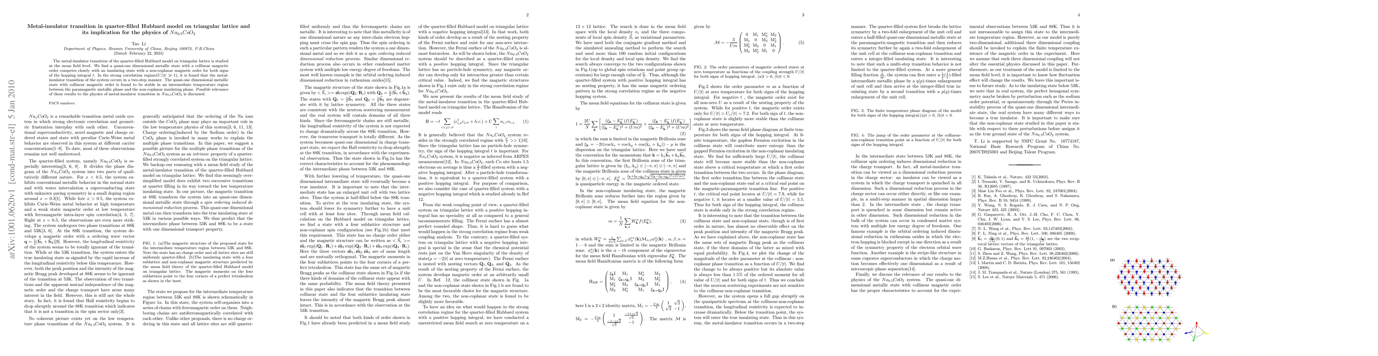 The metal-insulator transition of the quarter-filled Hubbard model on triangular lattice is studied at the mean field level. We find a quasi-one dimensional metallic state with a collinear magnetic order competes closely with an insulating state with a non-coplanar magnetic order for both signs of the hopping integral $t$. In the strong correlation regime($U/|t|\gg1$), it is found that the metal-insulator transition of the system occurs in a two-step manner. The quasi-one dimensional metallic state with collinear magnetic order is found to be stable in an intermediate temperature region between the paramagnetic metallic phase and the non-coplanar insulating phase. Possible relevance of these results to the physics of metal-insulator transition in $Na_{0.5}CoO_{2}$ is discussed.