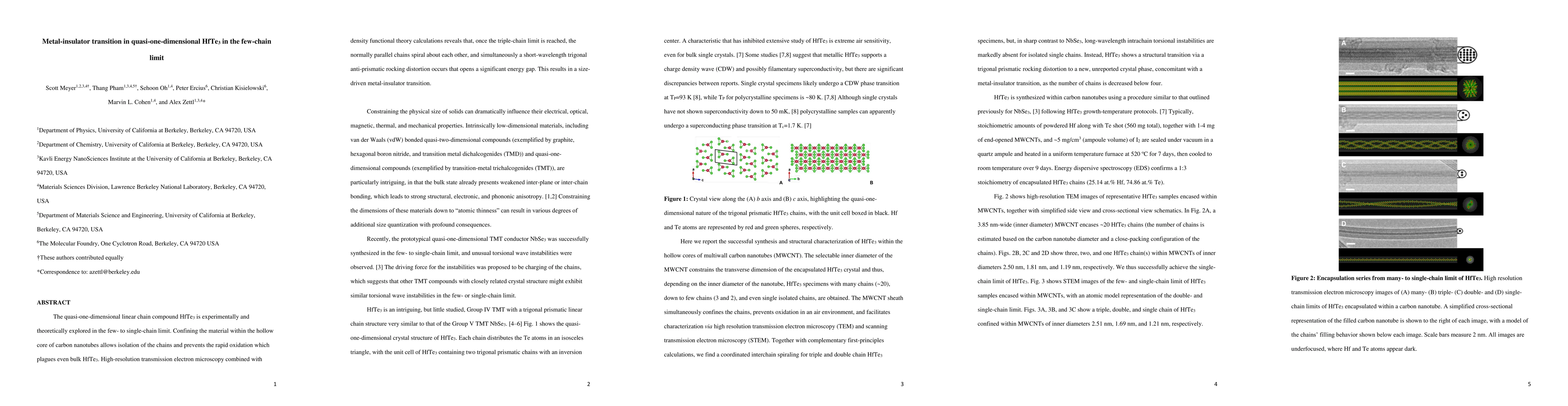 The quasi-one-dimensional linear chain compound HfTe3 is experimentally and theoretically explored in the few- to single-chain limit. Confining the material within the hollow core of carbon nanotubes allows isolation of the chains and prevents the rapid oxidation which plagues even bulk HfTe3. High-resolution transmission electron microscopy combined with density functional theory calculations reveals that, once the triple-chain limit is reached, the normally parallel chains spiral about each other, and simultaneously a short-wavelength trigonal anti-prismatic rocking distortion occurs that opens a significant energy gap. This results in a size-driven metal-insulator transition.