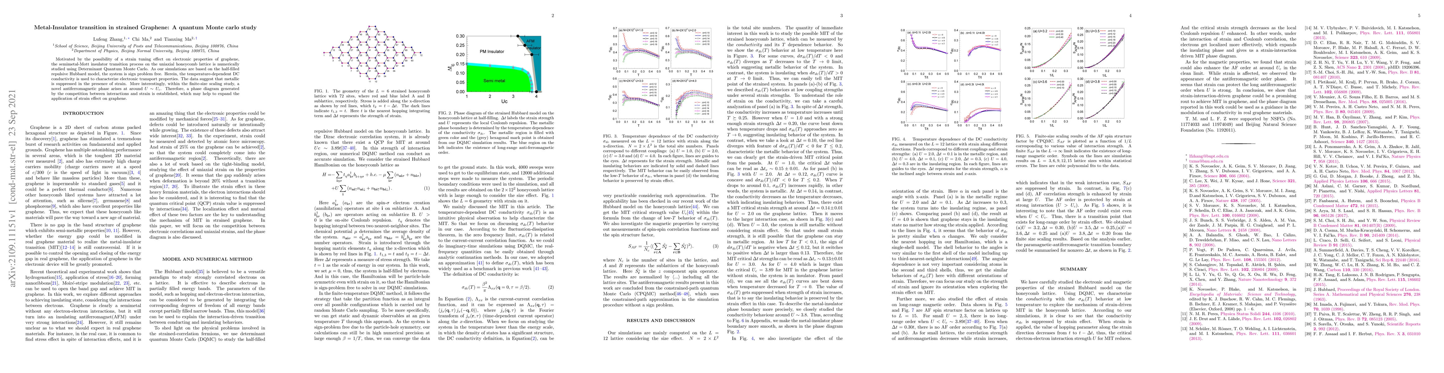 This study uses Quantum Monte Carlo simulations to investigate the metal-insulator transition in strained graphene. Findings suggest that strain suppresses metallic behavior and introduces an antiferromagnetic phase, contributing to a phase diagram illustrating the interplay between interactions and strain in graphene.