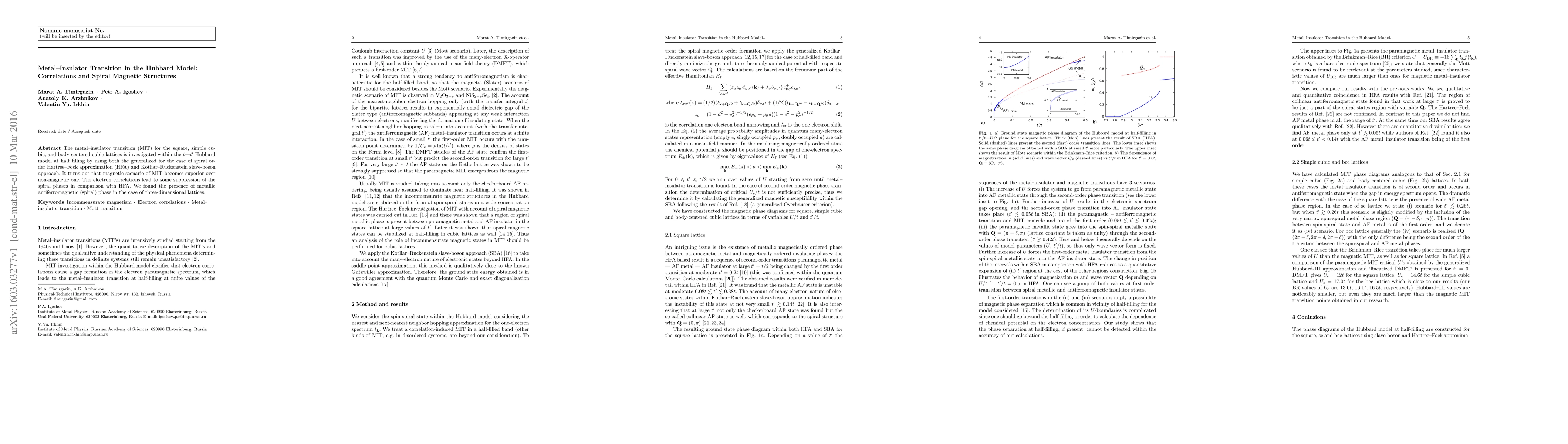 The study investigates the metal-insulator transition in the $t-t'$ Hubbard model across various lattices, revealing that magnetic scenarios dominate over non-magnetic ones. Electron correlations suppress spiral phases, but metallic antiferromagnetic (spiral) phases exist in three-dimensional lattices.
