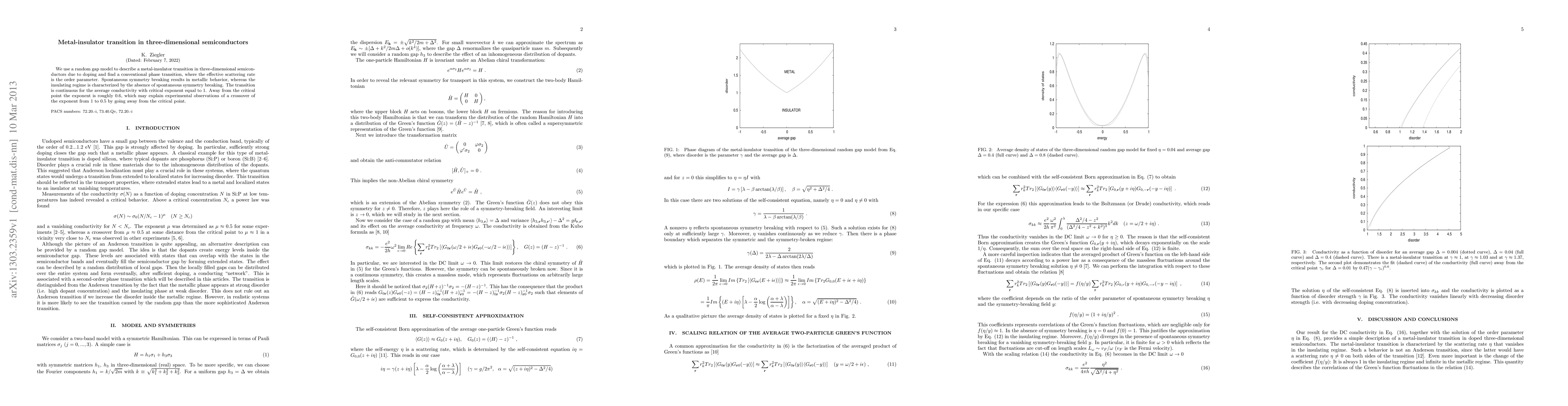 We use a random gap model to describe a metal-insulator transition in three-dimensional semiconductors due to doping and find a conventional phase transition, where the effective scattering rate is the order parameter. Spontaneous symmetry breaking results in metallic behavior, whereas the insulating regime is characterized by the absence of spontaneous symmetry breaking. The transition is continuous for the average conductivity with critical exponent equal to 1. Away from the critical point the exponent is roughly 0.6, which may explain experimental observations of a crossover of the exponent from 1 to 0.5 by going away from the critical point.