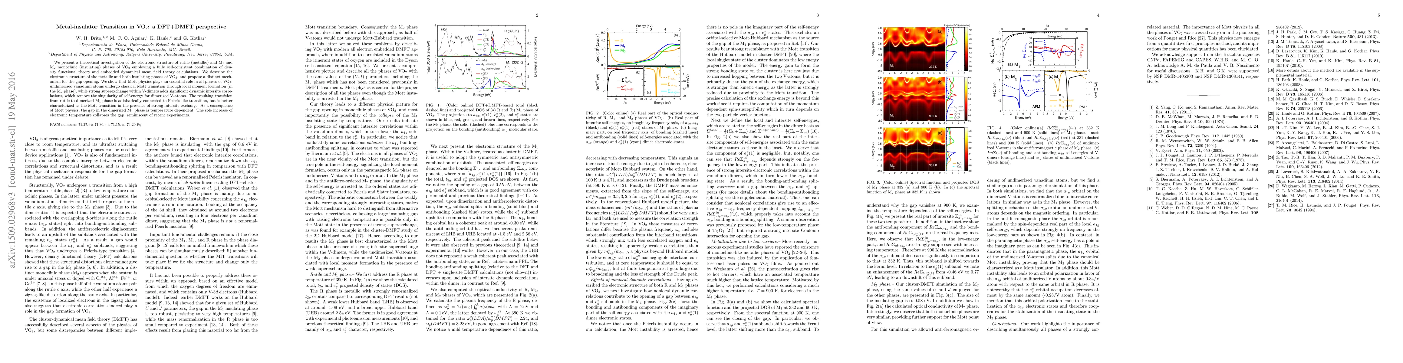 We present a theoretical investigation of the electronic structure of rutile (metallic) and M$_1$ and M$_2$ monoclinic (insulating) phases of VO$_2$ employing a fully self-consistent combination of density functional theory and embedded dynamical mean field theory calculations. We describe the electronic structure of the metallic and both insulating phases of VO$_2$, and propose a distinct mechanism for the gap opening. We show that Mott physics plays an essential role in all phases of VO$_2$: undimerized vanadium atoms undergo classical Mott transition through local moment formation (in the M$_2$ phase), while strong superexchange within V-dimers adds significant dynamic intersite correlations, which remove the singularity of self-energy for dimerized V-atoms. The resulting transition from rutile to dimerized M$_1$ phase is adiabatically connected to Peierls-like transition, but is better characterized as the Mott transition in the presence of strong intersite exchange. As a consequence of Mott physics, the gap in the dimerized M$_1$ phase is temperature dependent. The sole increase of electronic temperature collapses the gap, reminiscent of recent experiments.