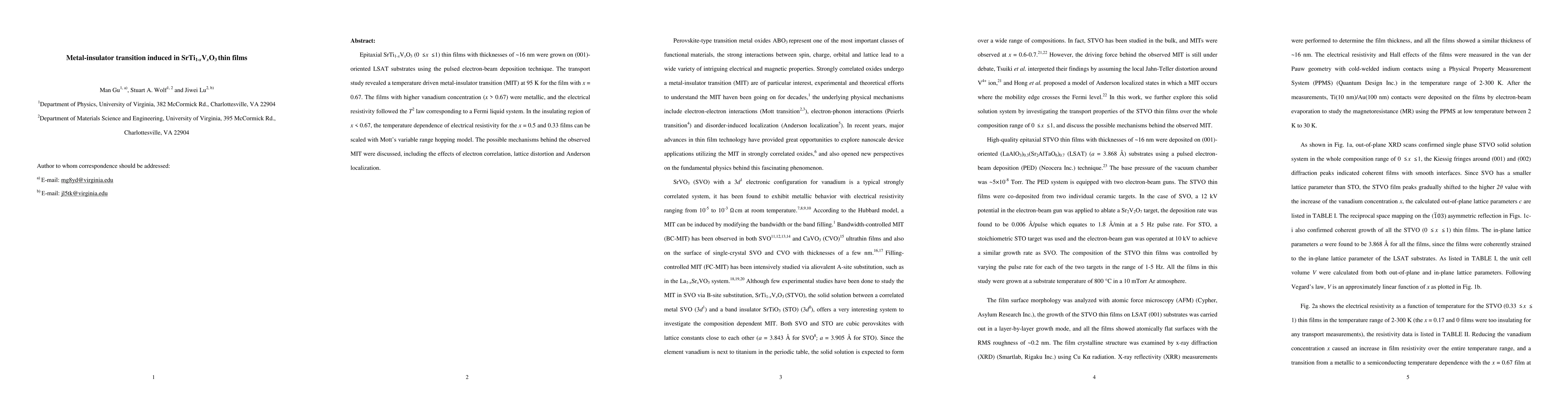 The paper presents a detailed analysis of the metal-insulator transition in SrTi1-xVxO3 thin films, identifying the role of electron correlation, lattice distortion, and Anderson localization.