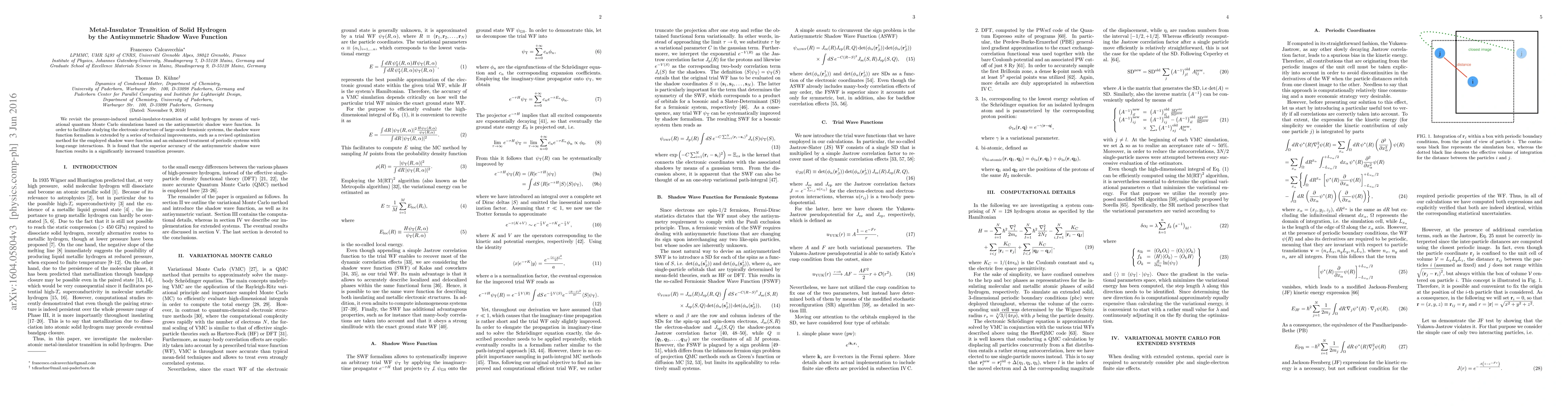This paper investigates the pressure-induced metal-insulator transition in solid hydrogen using variational quantum Monte Carlo simulations with an improved antisymmetric shadow wave function. The study finds that the enhanced wave function formalism leads to a higher transition pressure compared to previous methods.