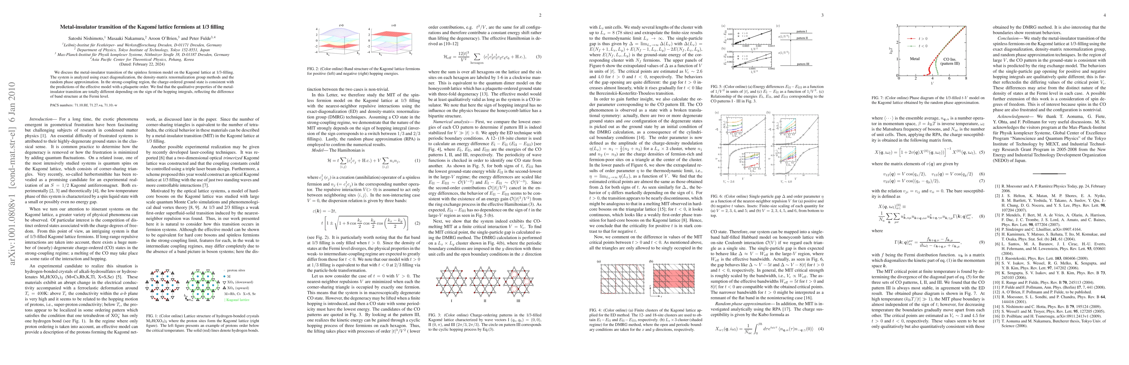 We discuss the metal-insulator transition of the spinless fermion model on the Kagom\'{e} lattice at 1/3-filling. The system is analyzed using exact diagonalization, the density-matrix renormalization group methods and the random phase approximation. In the strong-coupling region, the charge-ordered ground state is consistent with the predictions of the effective model with a plaquette order. We find that the qualitative properties of the metal-insulator transition are totally different depending on the sign of the hopping integrals, reflecting the difference of band structure at the Fermi level.