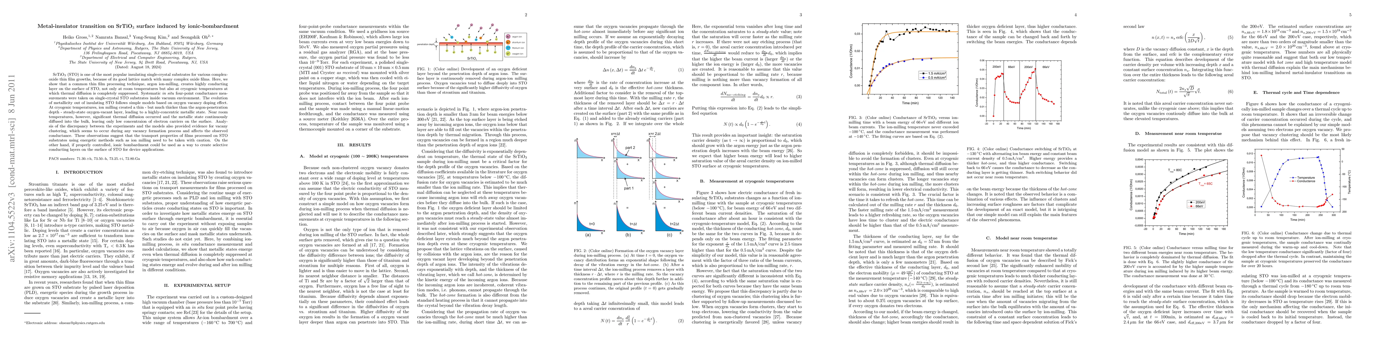 SrTiO$_{3}$ is one of the most popular insulating single-crystal substrates for various complex-oxide thin film growths, because of its good lattice match with many complex oxide films. Here, we show that a common thin film processing technique, argon ion-milling, creates highly conducting layer on the surface of STO, not only at room temperatures but also at cryogenic temperatures at which thermal diffusion is completely suppressed. Systematic \emph{in situ} four-point conductance measurements were taken on single-crystal STO substrates inside vacuum environment. The evolution of metallicity out of insulating STO follows simple models based on oxygen vacancy doping effect. At cryogenic temperatures, ion milling created a thin - but much thicker than the argon-penetration depth - steady-state oxygen-vacant layer, leading to a highly-concentric metallic state. Near room temperatures, however, significant thermal diffusion occurred and the metallic state continuously diffused into the bulk, leaving only low concentraion of electron carriers on the surface. Analysis of the discrepancy between the experiments and the models also provided evidence for vacany clustering, which seems to occur during any vacancy formation process and affects the observed conductance. These observations suggest that the transport properties of films processed on STO substrates using energetic methods such as ion milling need to be taken with caution. On the other hand, if properly controlled, ionic bombardment could be used as a way to create selective conducting layers on the surface of STO for device applications.