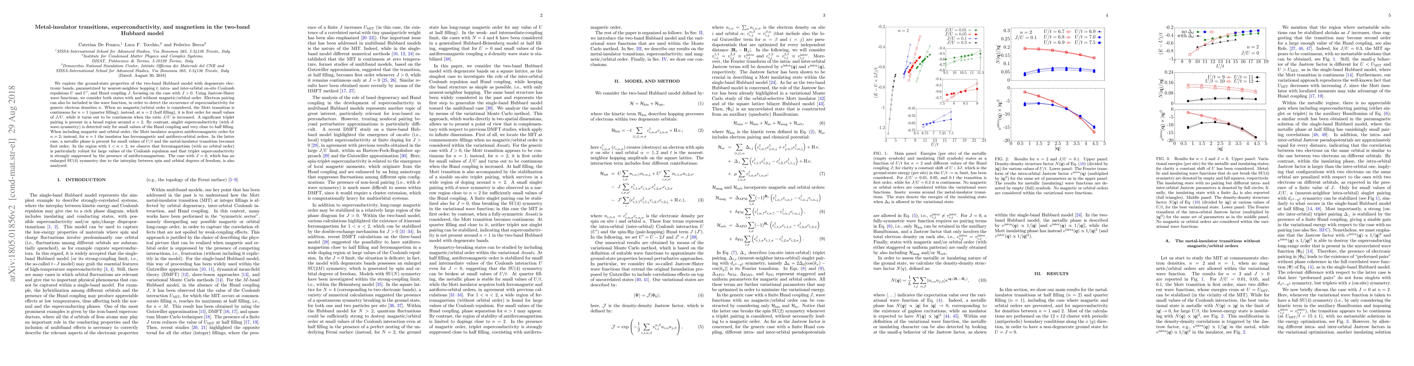 Researchers studied the two-band Hubbard model to explore metal-insulator transitions, superconductivity, and magnetism under various conditions, finding that superconductivity is more likely at half filling for small Hund coupling values.