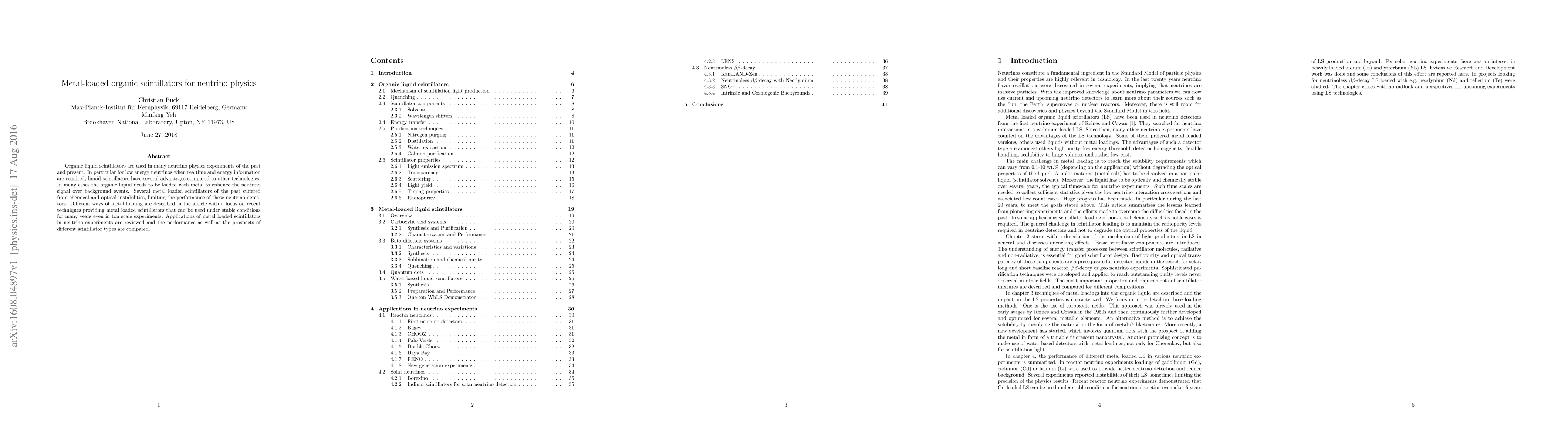 This paper reviews metal-loaded organic liquid scintillators used in neutrino physics, highlighting recent advancements that address chemical and optical instabilities. It compares the performance of various scintillator types and their applications in low-energy neutrino detection.