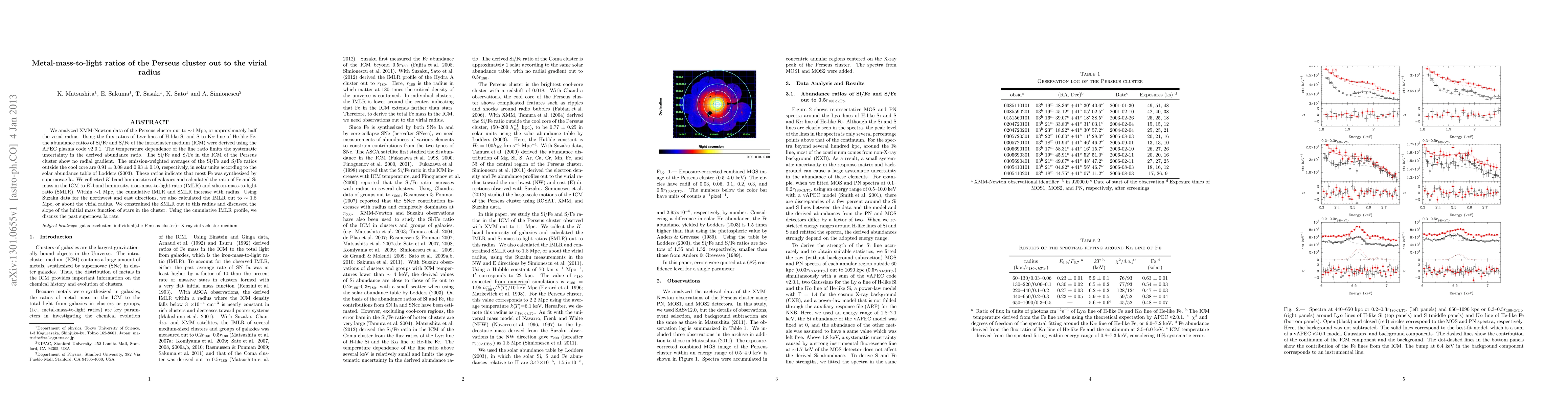 This paper analyzes XMM-Newton data of the Perseus cluster to determine the metal-mass-to-light ratios out to the virial radius, finding no radial gradient in Si/Fe and S/Fe ratios. The study reveals an increase in the iron-mass-to-light ratio with radius, suggesting implications for the past supernova Ia rate and the slope of the initial mass function of stars in the cluster.