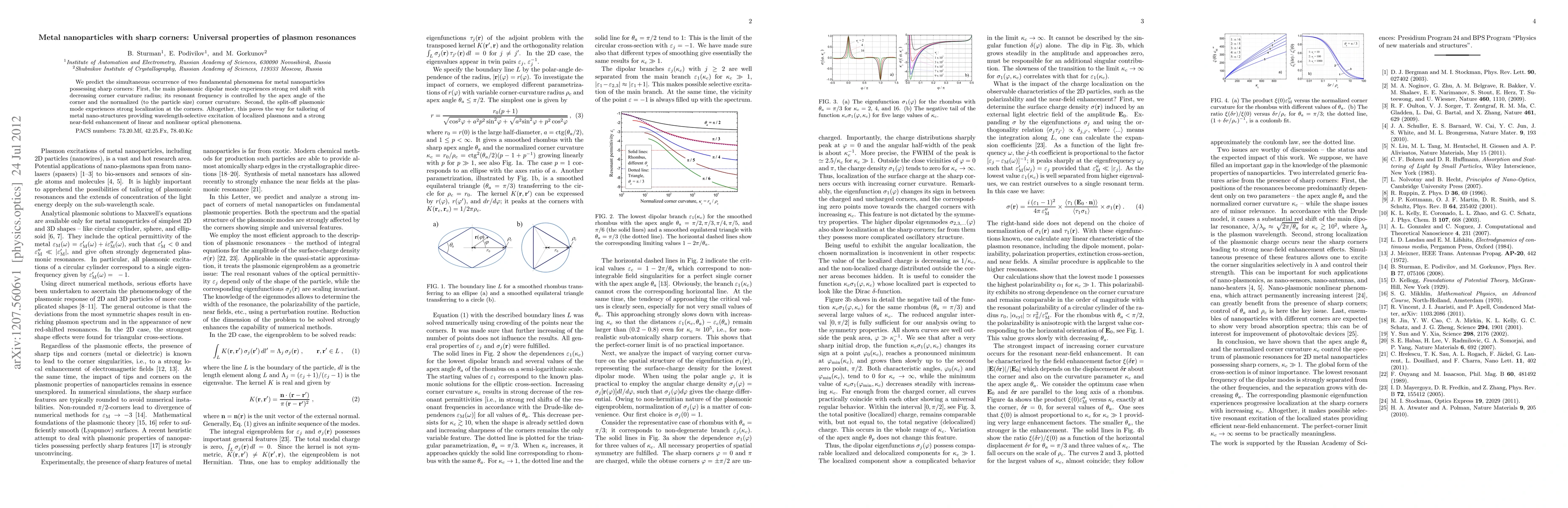 Researchers predict that metal nanoparticles with sharp corners have unique optical properties, including a red shift in their resonant frequency and enhanced localization of plasmons at the corners, enabling tailored excitation of localized plasmons and near-field enhancement.