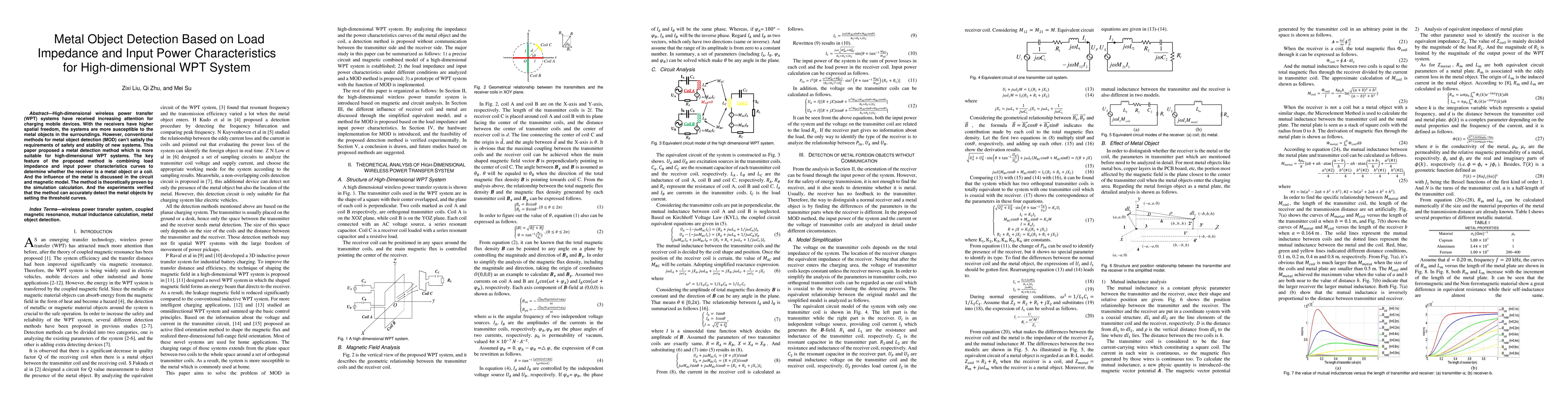 High-dimensional wireless power transfer (WPT) systems have received increasing attention for charging mobile devices. With the receivers have higher spatial freedom, the systems are more susceptible to the metal objects in the surroundings. However, conventional methods for metal object detection (MOD) can't satisfy the requirements of safety and stability of new systems. This paper proposed a metal detection method which is more suitable for high-dimensional WPT systems. The key feature of the proposed method is combining load impedance and input power characteristics curves to determine whether the receiver is a metal object or a coil. And the influence of the metal is discussed in the circuit and magnetic model. The method is theoretically proven by the simulation calculation. And the experiments verified that the method can accurately detect the metal objects by setting the threshold curves.