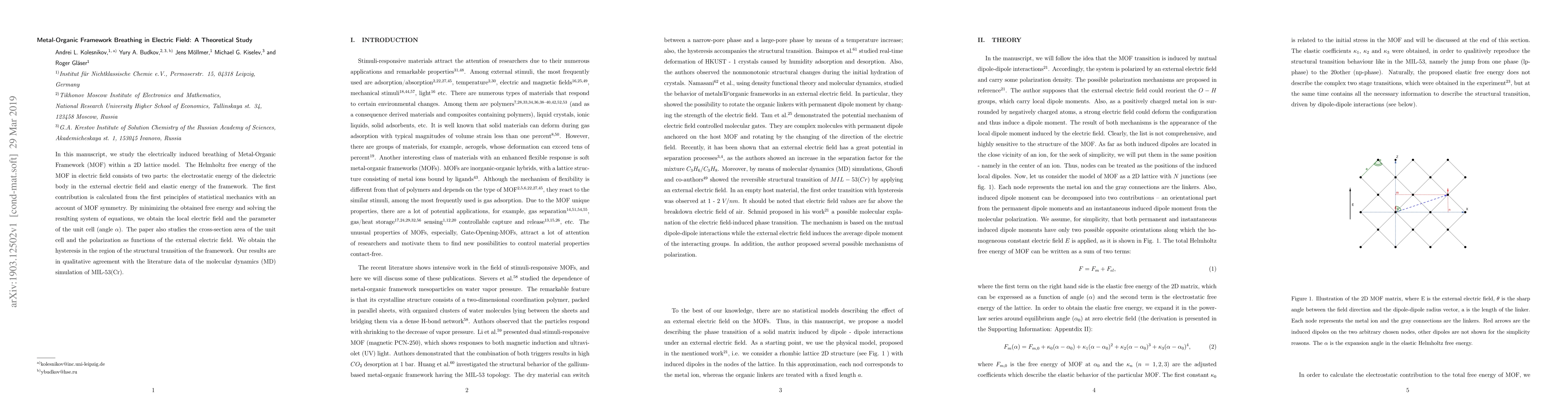 This paper investigates the electrically induced "breathing" behavior of Metal-Organic Frameworks (MOFs) within a 2D lattice model, focusing on the Helmholtz free energy and electrostatic effects. The study reveals hysteresis and structural transitions in the MOF under an external electric field, with results aligning with molecular dynamics simulations of MIL-53(Cr).