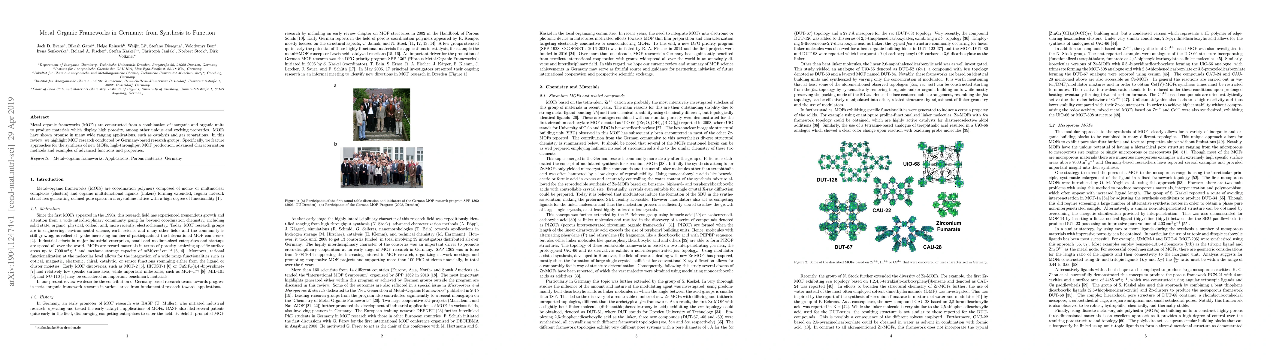 The paper reviews research on Metal-Organic Frameworks (MOFs) conducted by German-based research groups, focusing on synthesis approaches, high-throughput production, advanced characterization methods, and advanced functions of MOFs.