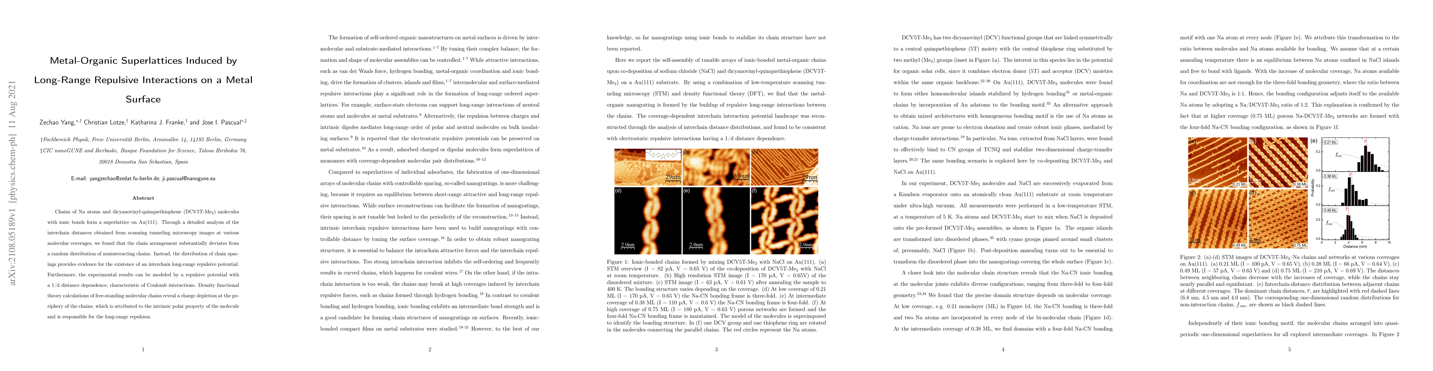This paper investigates the formation of metal-organic superlattices on a Au(111) surface, revealing that chains of Na atoms and DCV5T-Me2 molecules exhibit long-range repulsive interactions, deviating from random distributions. The observed interchain spacings suggest a 1/d repulsive potential, modeled by Coulomb interactions, due to charge depletion at the molecular chain periphery.