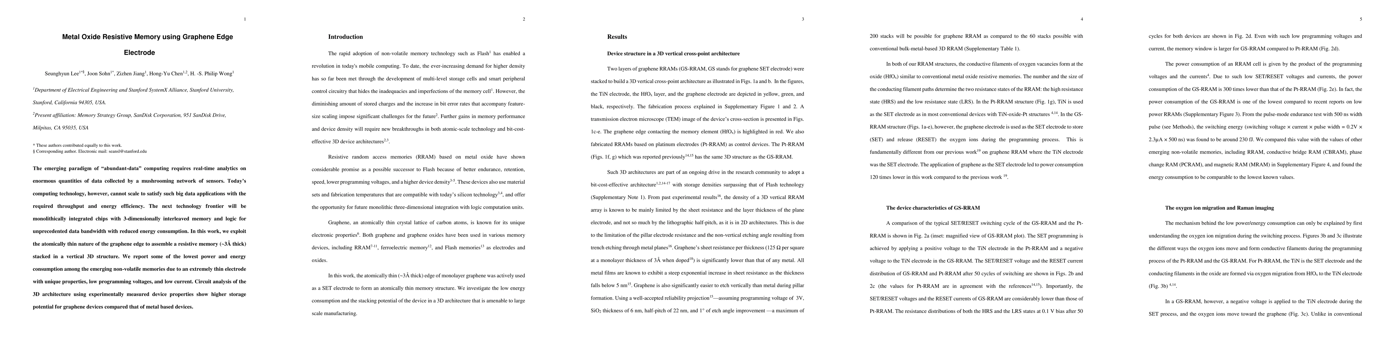 The emerging paradigm of abundant-data computing requires real-time analytics on enormous quantities of data collected by a mushrooming network of sensors. Todays computing technology, however, cannot scale to satisfy such big data applications with the required throughput and energy efficiency. The next technology frontier will be monolithically integrated chips with three dimensionally interleaved memory and logic for unprecedented data bandwidth with reduced energy consumption. In this work, we exploit the atomically thin nature of the graphene edge to assemble a resistive memory stacked in a vertical three dimensional structure. We report some of the lowest power and energy consumption among the emerging non-volatile memories due to an extremely thin electrode with unique properties, low programming voltages, and low current. Circuit analysis of the architecture using experimentally measured device properties show higher storage potential for graphene devices compared that of metal based devices.
