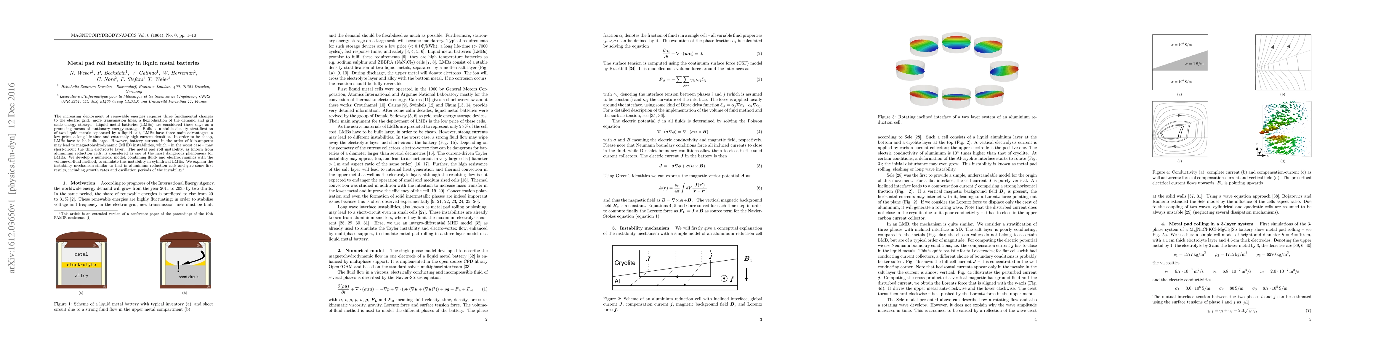 This paper investigates the metal pad roll instability in liquid metal batteries, a phenomenon that can lead to short-circuiting due to high currents and magnetohydrodynamic effects. The authors develop a numerical model to simulate this instability, providing insights into growth rates and oscillation periods.