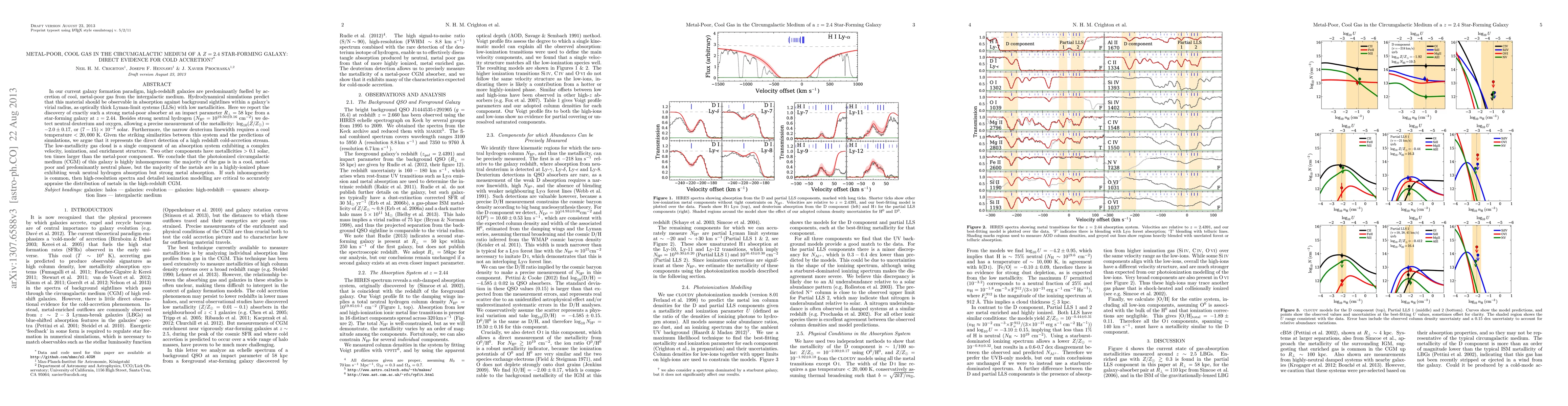 This paper reports the discovery of a strong, metal-poor gas absorber in the circumgalactic medium of a z = 2.44 star-forming galaxy, providing direct evidence for cold accretion streams predicted by simulations. The gas shows a cool temperature, low metallicity, and complex velocity structure, suggesting significant inhomogeneity in the galaxy's photoionized circumgalactic medium.