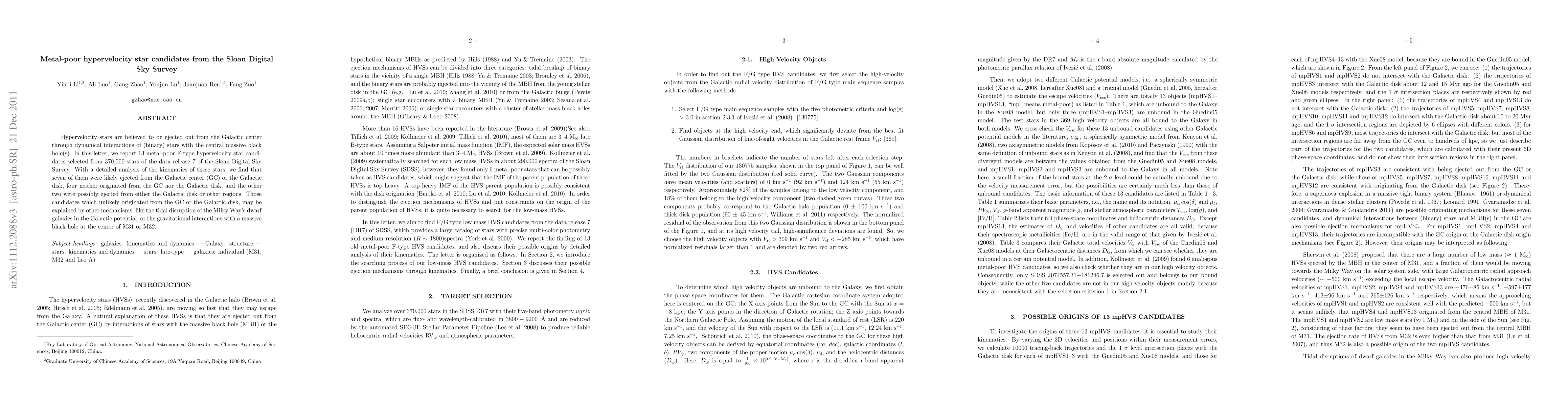 This paper identifies 13 metal-poor F-type hypervelocity star candidates from the Sloan Digital Sky Survey, analyzing their kinematics to determine their origins. Seven candidates likely originated from the Galactic center, while others may have come from the Galactic disk or other regions, suggesting alternative ejection mechanisms.
