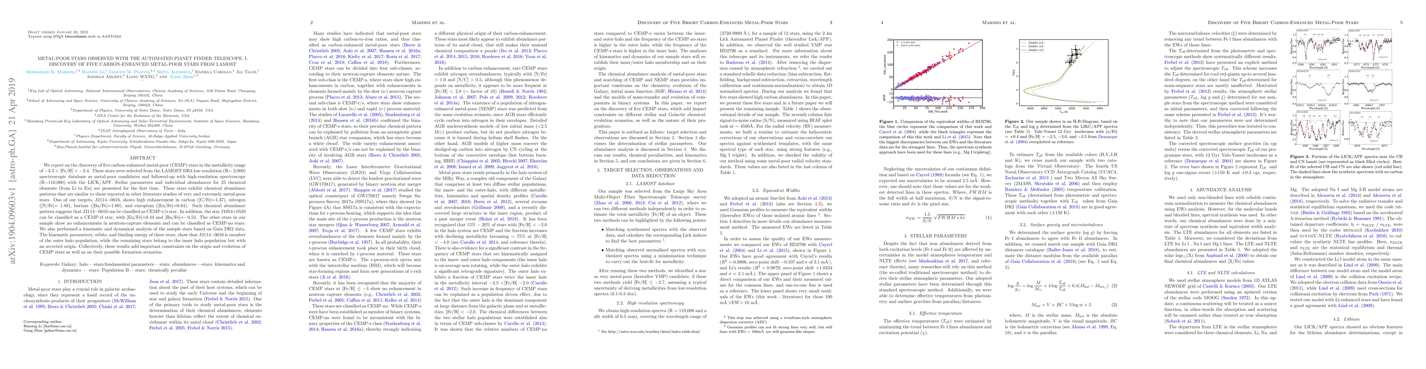 This paper reports the discovery of five carbon-enhanced metal-poor stars (CEMP) from LAMOST data, characterized by high carbon and nitrogen enhancements. The study provides detailed chemical abundances and kinematic analysis, suggesting different formation scenarios for these stars, with one belonging to the outer halo and the rest to the inner halo.