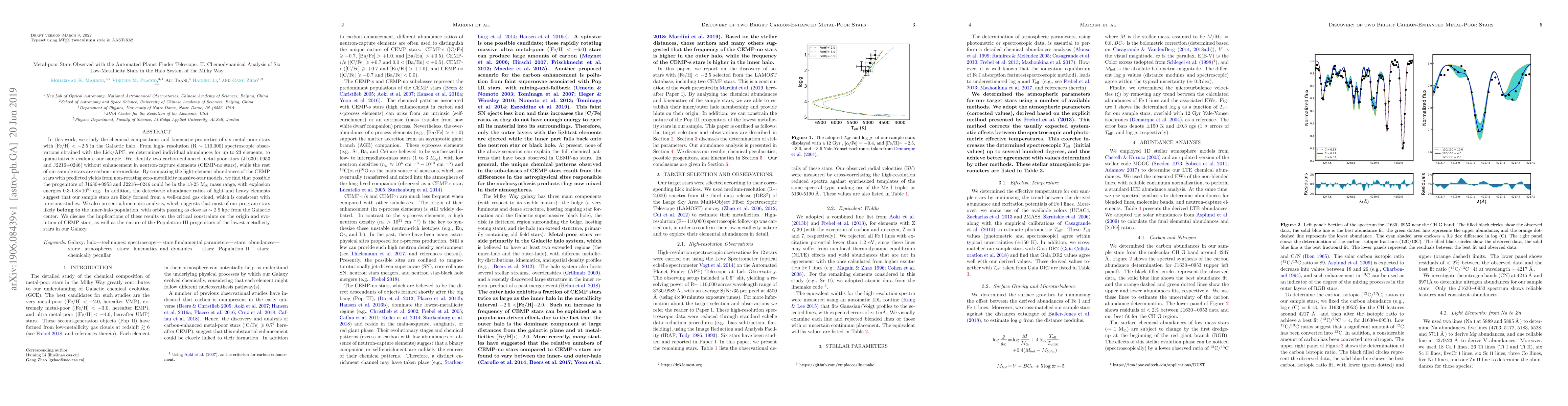 In this work, we study the chemical compositions and kinematic properties of six metal-poor stars with [Fe/H] $< -2.5$ in the Galactic halo. From high-resolution (R $\sim$~110,000) spectroscopic observations obtained with the Lick/APF, we determined individual abundances for up to 23 elements, to quantitatively evaluate our sample. We identify two carbon-enhanced metal-poor stars (J1630+0953 and J2216+0246) without enhancement in neutron-capture elements (CEMP-no stars), while the rest of our sample stars are carbon-intermediate. By comparing the light-element abundances of the CEMP stars with predicted yields from non-rotating zero-metallicity massive-star models, we find that possible the progenitors of J1630+0953 and J2216+0246 could be in the 13-25 M$_{\odot}$ mass range, with explosion energies 0.3-1.8$ \times 10^{51}$ erg. In addition, the detectable abundance ratios of light and heavy elements suggest that our sample stars are likely formed from a well-mixed gas cloud, which is consistent with previous studies. We also present a kinematic analysis, which suggests that most of our program stars likely belong to the inner-halo population, with orbits passing as close as $\sim$ 2.9 kpc from the Galactic center. We discuss the implications of these results on the critical constraints on the origin and evolution of CEMP stars, as well as the nature of the Population III progenitors of the lowest metallicity stars in our Galaxy.