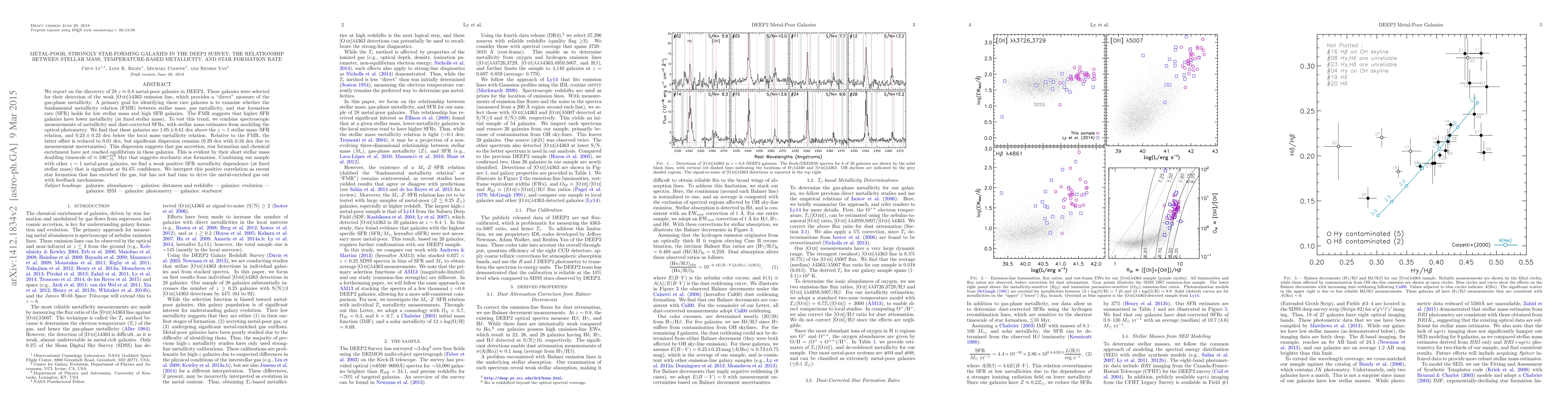 We report on the discovery of 28 $z\approx0.8$ metal-poor galaxies in DEEP2. These galaxies were selected for their detection of the weak [OIII]$\lambda$4363 emission line, which provides a "direct" measure of the gas-phase metallicity. A primary goal for identifying these rare galaxies is to examine whether the fundamental metallicity relation (FMR) between stellar mass, gas metallicity, and star formation rate (SFR) holds for low stellar mass and high SFR galaxies. The FMR suggests that higher SFR galaxies have lower metallicity (at fixed stellar mass). To test this trend, we combine spectroscopic measurements of metallicity and dust-corrected SFRs, with stellar mass estimates from modeling the optical photometry. We find that these galaxies are $1.05\pm0.61$ dex above the z~1 stellar mass-SFR relation, and $0.23\pm0.23$ dex below the local mass-metallicity relation. Relative to the FMR, the latter offset is reduced to 0.01 dex, but significant dispersion remains (0.29 dex with 0.16 dex due to measurement uncertainties). This dispersion suggests that gas accretion, star formation and chemical enrichment have not reached equilibrium in these galaxies. This is evident by their short stellar mass doubling timescale of $\approx100^{+310}_{-75}$ Myr that suggests stochastic star formation. Combining our sample with other z~1 metal-poor galaxies, we find a weak positive SFR-metallicity dependence (at fixed stellar mass) that is significant at 94.4% confidence. We interpret this positive correlation as recent star formation that has enriched the gas, but has not had time to drive the metal-enriched gas out with feedback mechanisms.