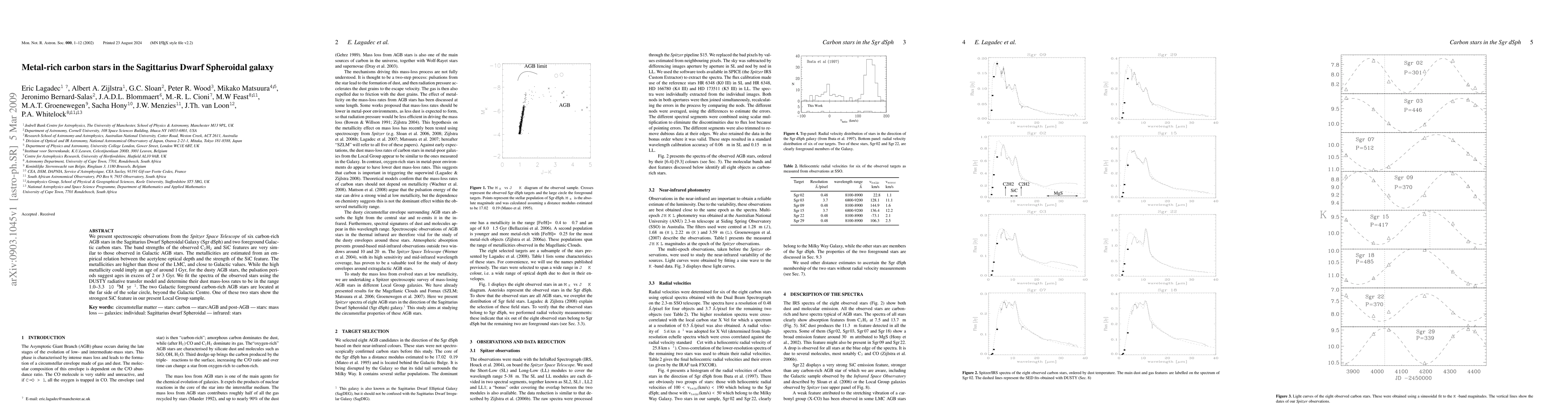 This study uses {\it Spitzer Space Telescope} observations to analyze six carbon-rich AGB stars in the Sagittarius Dwarf Spheroidal Galaxy, finding high metallicities close to Galactic values. The stars exhibit dust mass-loss rates between 1.0--3.3$\times 10^{-8}$ M$_{\odot}$ yr$^{-1}$, suggesting ages exceeding 2 or 3 Gyr despite the high metallicity.