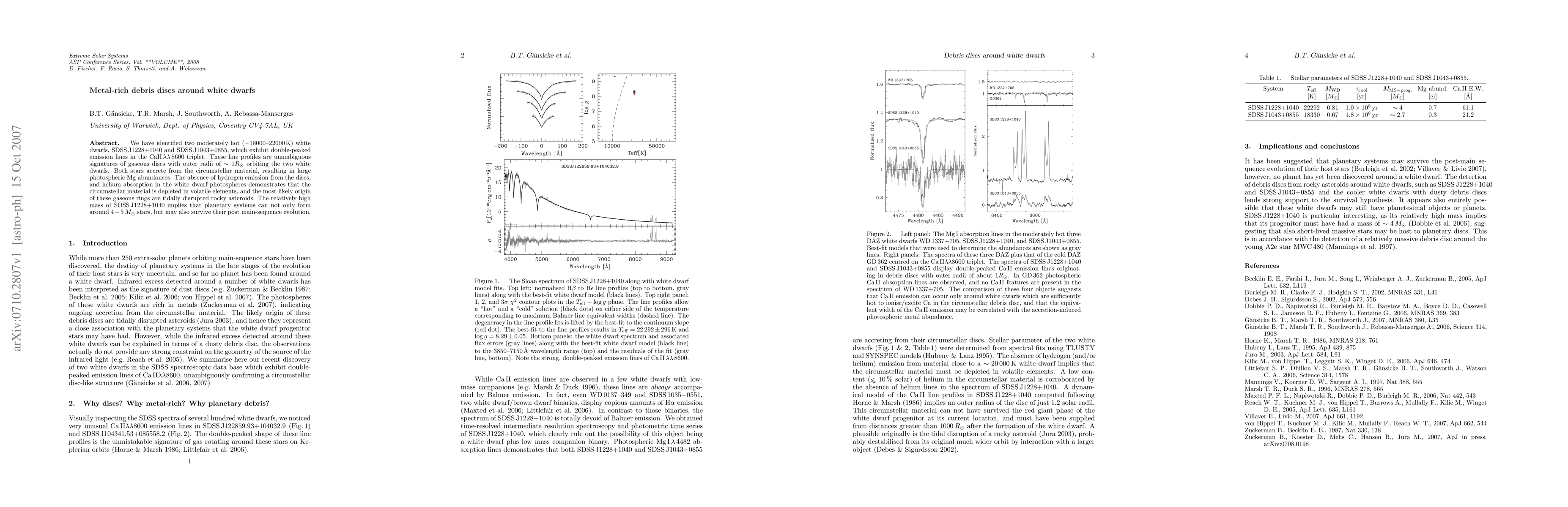 This study identifies gaseous debris discs around two metal-rich white dwarfs, SDSSJ1228+1040 and SDSSJ1043+0855, indicating the presence of tidally disrupted rocky asteroids. The findings suggest that planetary systems can survive the evolution of their host stars.