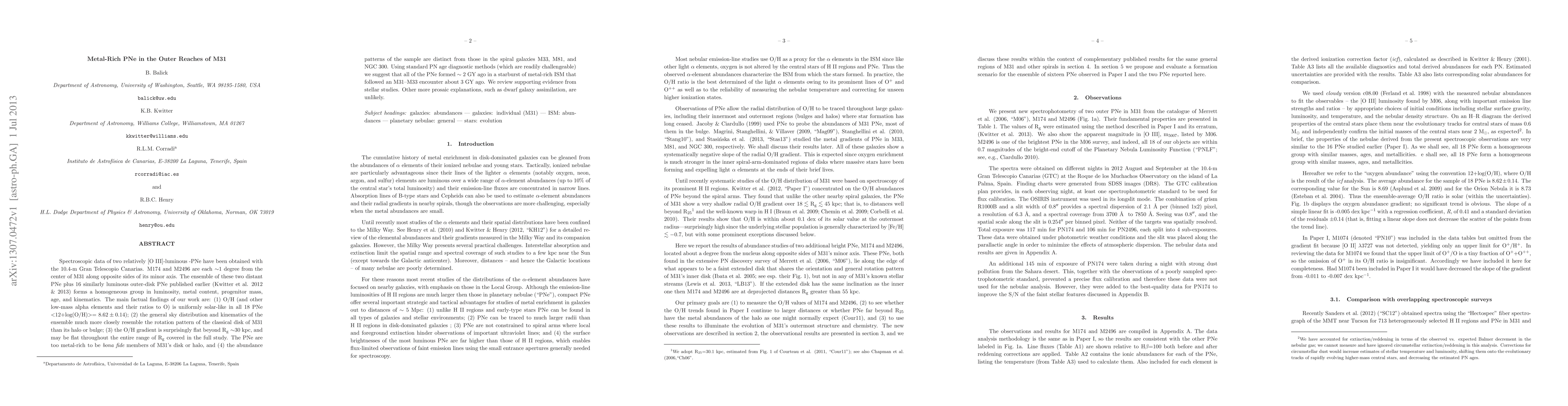 Spectroscopic data of two relatively [O III]-luminous-PNe have been obtained with the 10.4-m Gran Telescopio Canarias. M174 and M2496 are each ~1 degree from the center of M31 along opposite sides of its minor axis. The ensemble of these two distant PNe plus 16 similarly luminous outer-disk PNe published earlier (Kwitter et al. 2012 & 2013) forms a homogeneous group in luminosity, metal content, progenitor mass, age, and kinematics. The main factual findings of our work are: (1) O/H (and other low-mass alpha elements and their ratios to O) is uniformly solar-like in all 18 PNe <12+log(O/H)> = 8.62 +/- 0.14); (2) the general sky distribution and kinematics of the ensemble much more closely resemble the rotation pattern of the classical disk of M31 than its halo or bulge; (3) the O/H gradient is surprisingly flat beyond R_g ~30 kpc, and may be flat throughout the entire range of R_g covered in the full study. The PNe are too metal-rich to be bona fide members of M31's disk or halo, and (4) the abundance patterns of the sample are distinct from those in the spiral galaxies M33, M81, and NGC 300. Using standard PN age diagnostic methods (which are readily challengeable) we suggest that all of the PNe formed -2 GY ago in a starburst of metal-rich ISM that followed an M31-M33 encounter about 3 GY ago. We review supporting evidence from stellar studies. Other more prosaic explanations, such as dwarf galaxy assimilation, are unlikely.