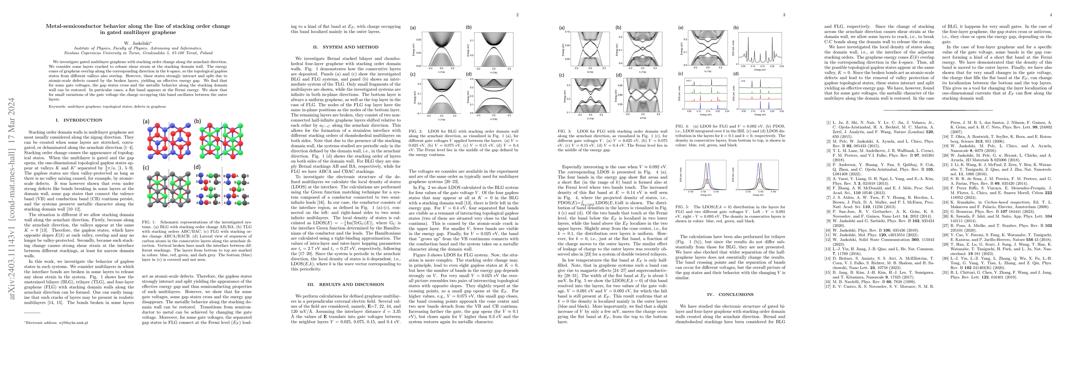This paper examines gated multilayer graphene with a stacking order change, finding that atomic-scale defects at domain walls cause an effective energy gap, but specific gate voltages can restore metallic behavior, sometimes leading to a flat band at the Fermi energy with oscillating charge.