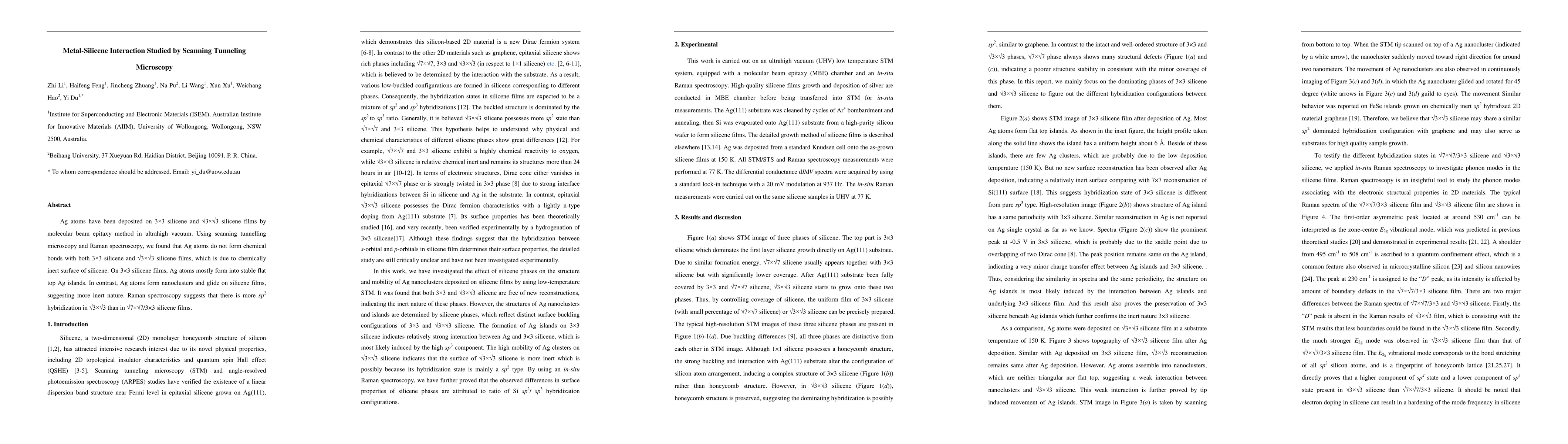The study demonstrates the use of scanning tunneling microscopy and Raman spectroscopy to investigate the interaction between Ag atoms and silicene films.