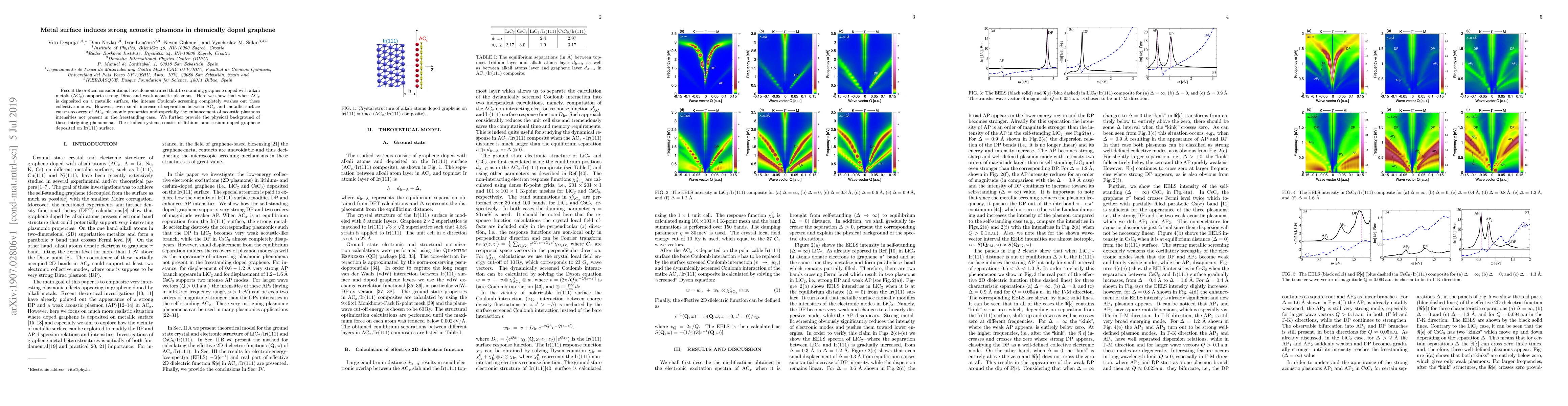 Recent theoretical considerations have demonstrated that freestanding graphene doped with alkali metals (AC x ) supports strong Dirac and weak acoustic plasmons. Here we show that when AC x is deposited on a metallic surface, the intense Coulomb screening completely washes out these collective modes. However, even small increase of separation between AC x and metallic surface causes recovery of AC x plasmonic properties and especially the enhancement of acoustic plasmons intensities not present in the freestanding case. We further provide the physical background of these intriguing phenomena. The studied systems consist of lithium- and cesium-doped graphene deposited on Ir(111) surface.