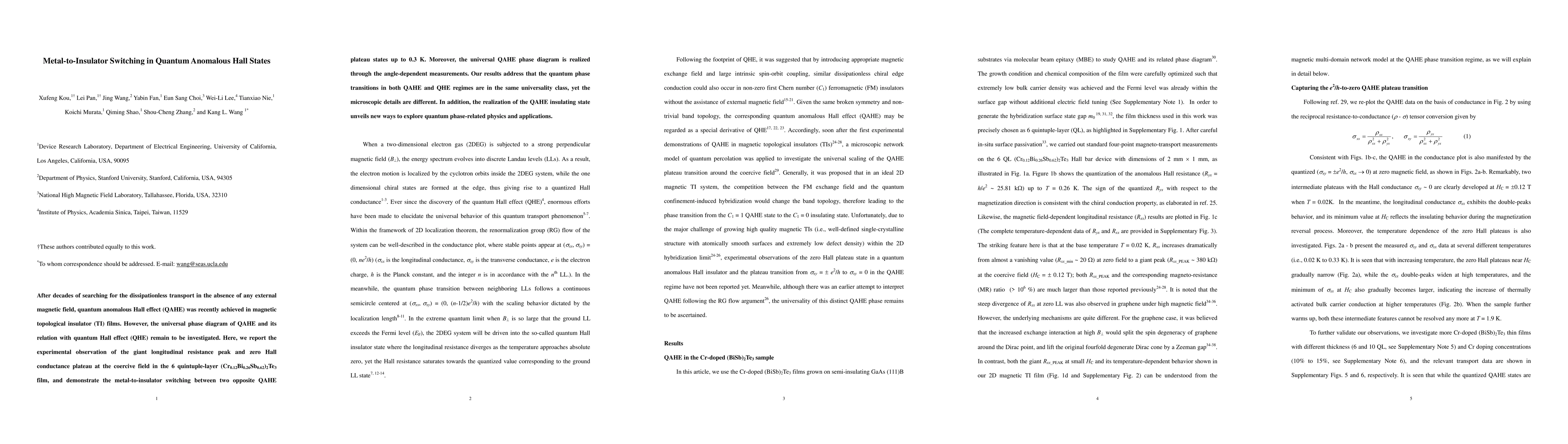 The paper reports experimental observation of metal-to-insulator switching in quantum anomalous Hall states within magnetic topological insulator films, demonstrating a universal phase diagram and revealing the same universality class for quantum phase transitions in both quantum anomalous and quantum Hall effects.