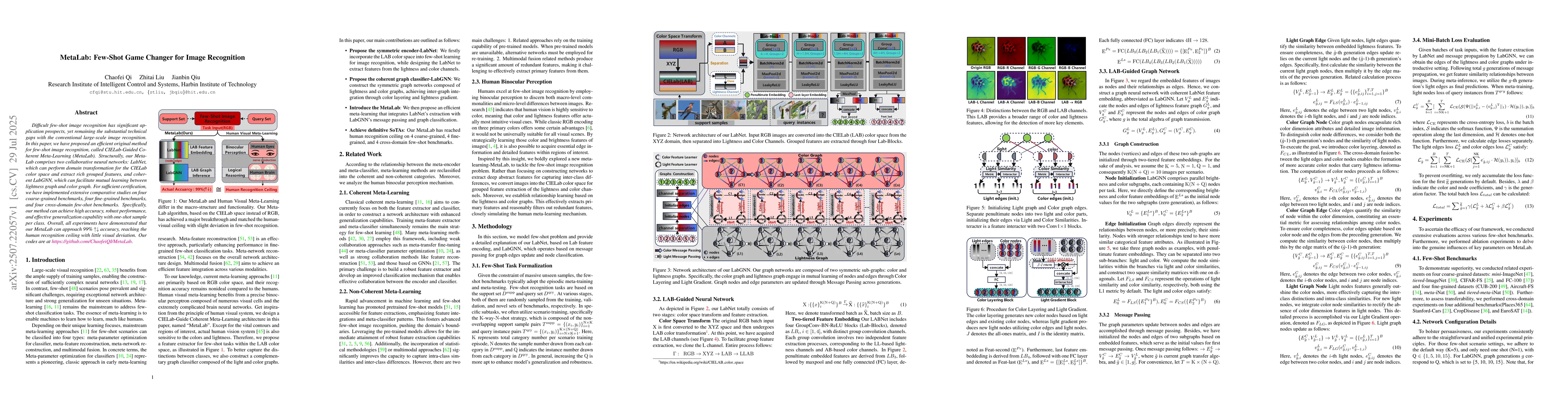 The paper proposes MetaLab, a method for few-shot image recognition that utilizes CIELab-Guided Coherent Meta-Learning, comprising LabNet for domain transformation and rich feature extraction, and LabGNN for mutual learning between lightness and color graphs.