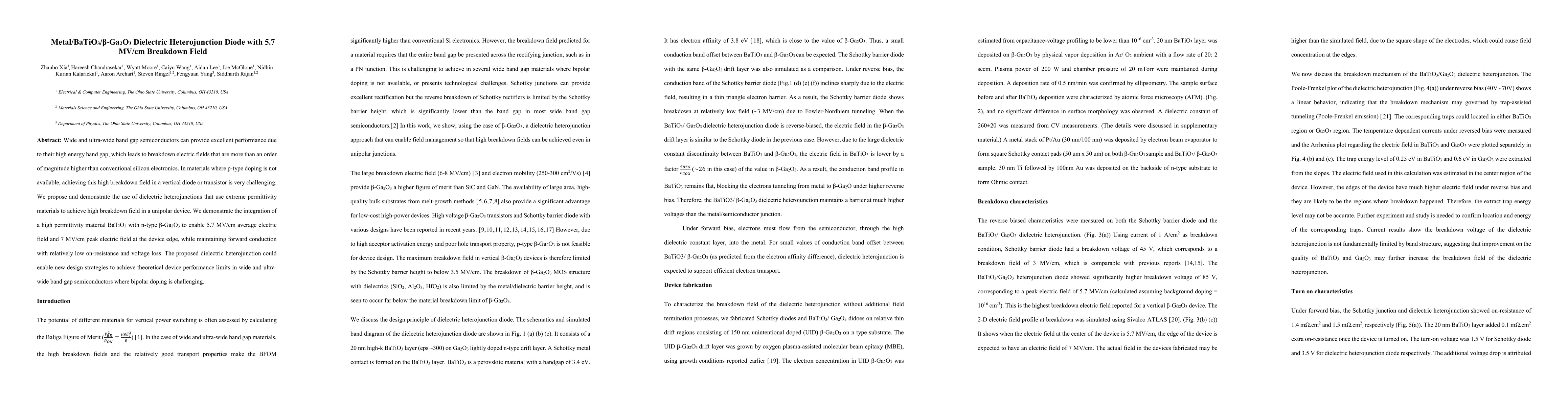 This paper proposes a Metal/BaTiO3/β-Ga2O3 dielectric heterojunction diode that achieves a high breakdown field of 5.7 MV/cm, leveraging the high permittivity of BaTiO3 to enhance performance in unipolar devices where p-type doping is unavailable. The integration maintains low on-resistance and voltage loss, suggesting new design strategies for high-performance wide band gap semiconductors.