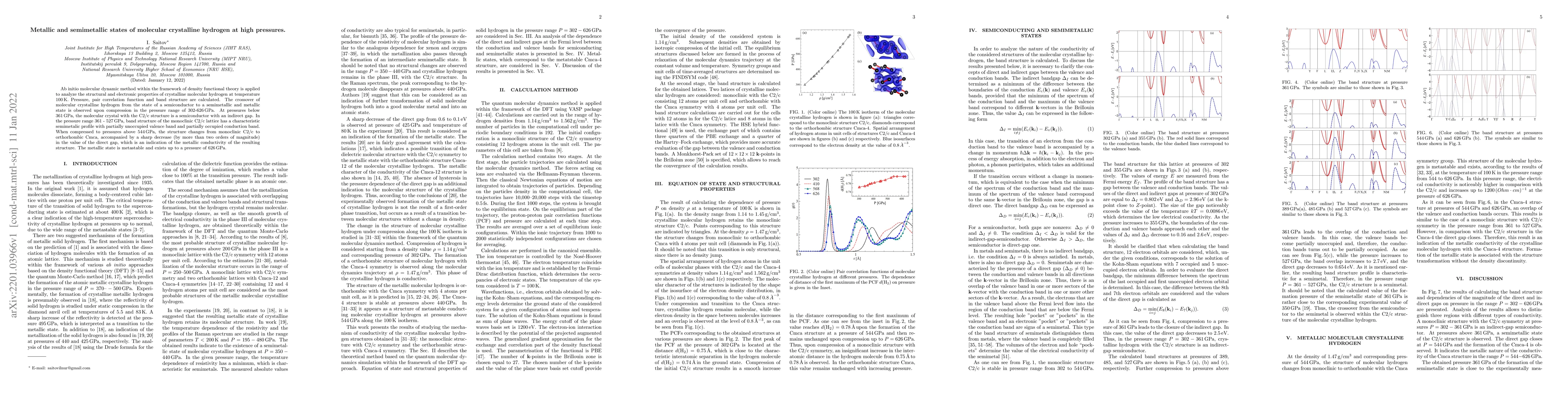 Using ab initio molecular dynamics and density functional theory, the paper reveals that molecular crystalline hydrogen transitions from a semiconductor to a semimetal, then to a metal under pressures between 302-626 GPa. This transformation involves structural changes from C2/c to Cmca, with a direct gap decrease indicating metallic conductivity above 544 GPa, lasting until 626 GPa.