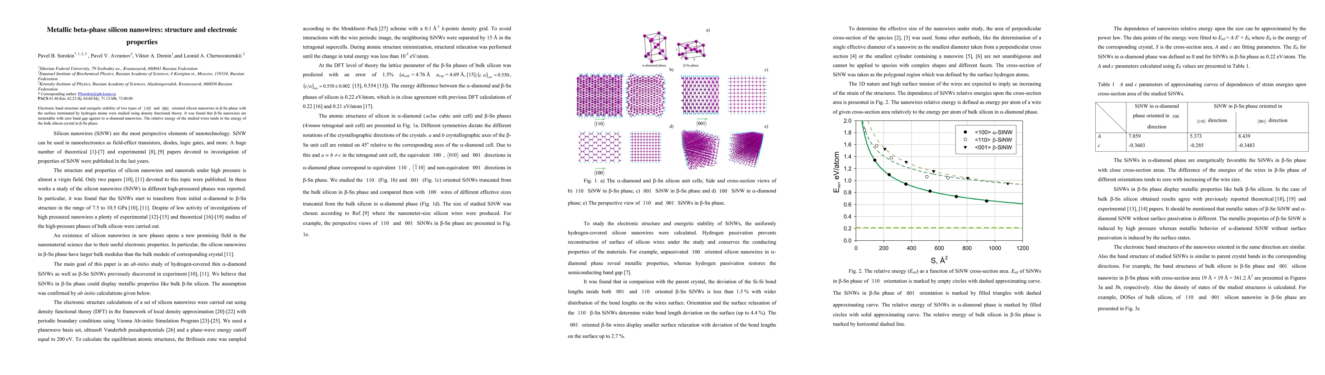 This study uses density functional theory to analyze the electronic band structure and stability of beta-Sn phase silicon nanowires terminated by hydrogen. The findings reveal that these nanowires are metastable and possess a zero band gap compared to alpha-diamond nanowires, with their relative energy approaching that of bulk silicon in the beta-Sn phase.