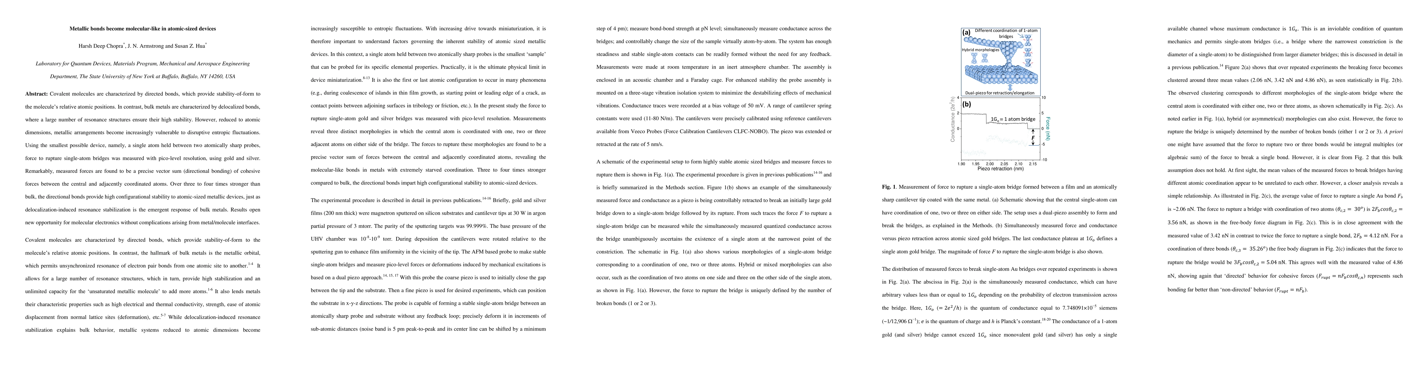 Covalent molecules are characterized by directed bonds, which provide stability-of-form to the molecules relative atomic positions. In contrast, bulk metals are characterized by delocalized bonds, where a large number of resonance structures ensure their high stability. However, reduced to atomic dimensions, metallic arrangements become increasingly vulnerable to disruptive entropic fluctuations. Using the smallest possible device, namely, a single atom held between two atomically sharp probes, force to rupture single-atom bridges was measured with pico-level resolution, using gold and silver. Remarkably, measured forces are found to be a precise vector sum (directional bonding) of cohesive forces between the central and adjacently coordinated atoms. Over three to four times stronger than bulk, the directional bonds provide high configurational stability to atomic-sized metallic devices, just as delocalization-induced resonance stabilization is the emergent response of bulk metals. Results open new opportunity for molecular electronics without complications arising from metal/molecule interfaces.
