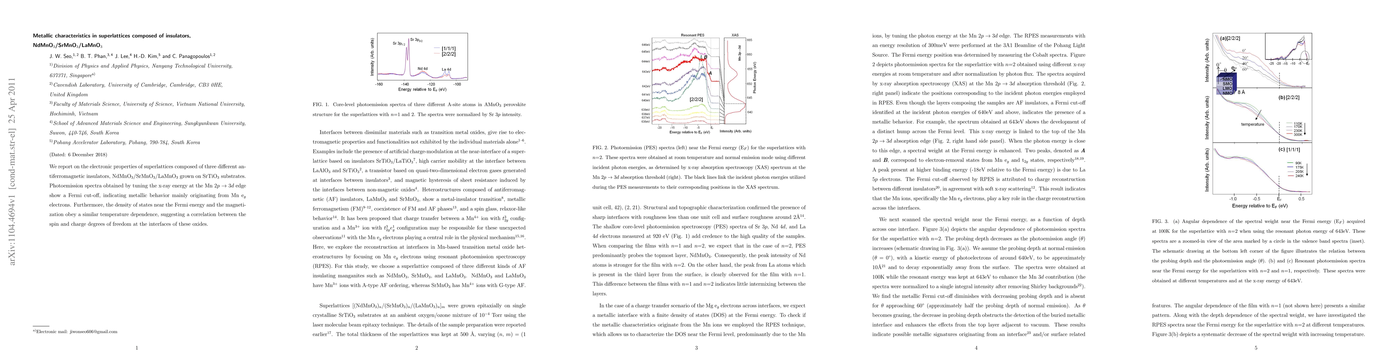 We report on the electronic properties of superlattices composed of three different antiferromagnetic insulators, NdMnO3/SrMnO3/LaMnO3 grown on SrTiO3 substrates. Photoemission spectra obtained by tuning the x-ray energy at the Mn 2p -> 3d edge show a Fermi cut-off, indicating metallic behavior mainly originating from Mn e_g electrons. Furthermore, the density of states near the Fermi energy and the magnetization obey a similar temperature dependence, suggesting a correlation between the spin and charge degrees of freedom at the interfaces of these oxides.
