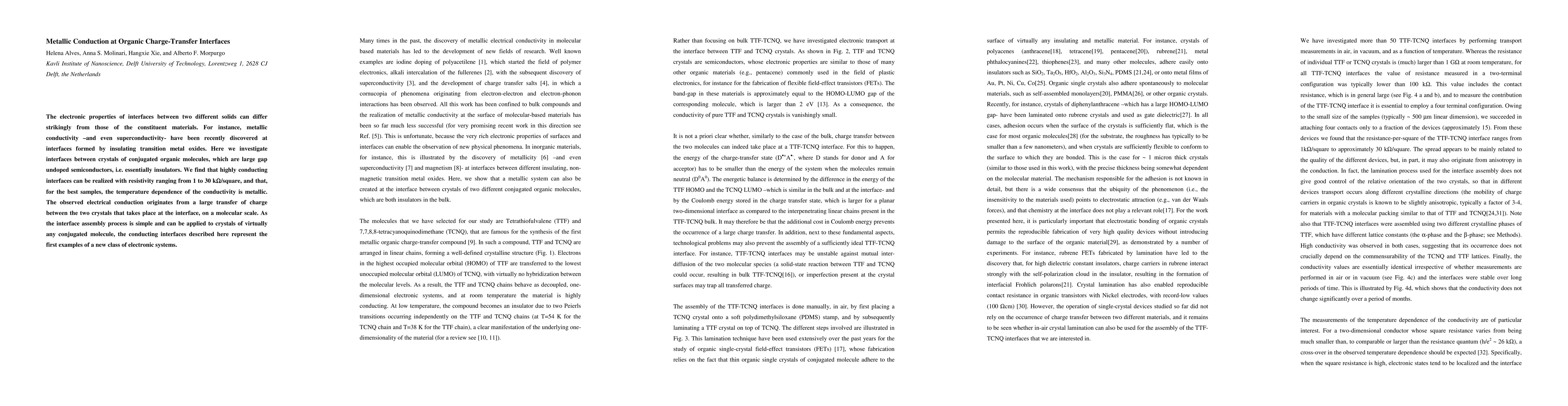 This paper investigates metallic conduction at interfaces between conjugated organic molecules, finding highly conductive interfaces with resistivity ranging from 1 to 30 kOhm square, due to significant charge transfer between the molecules at the interface. This discovery represents a new class of electronic systems.