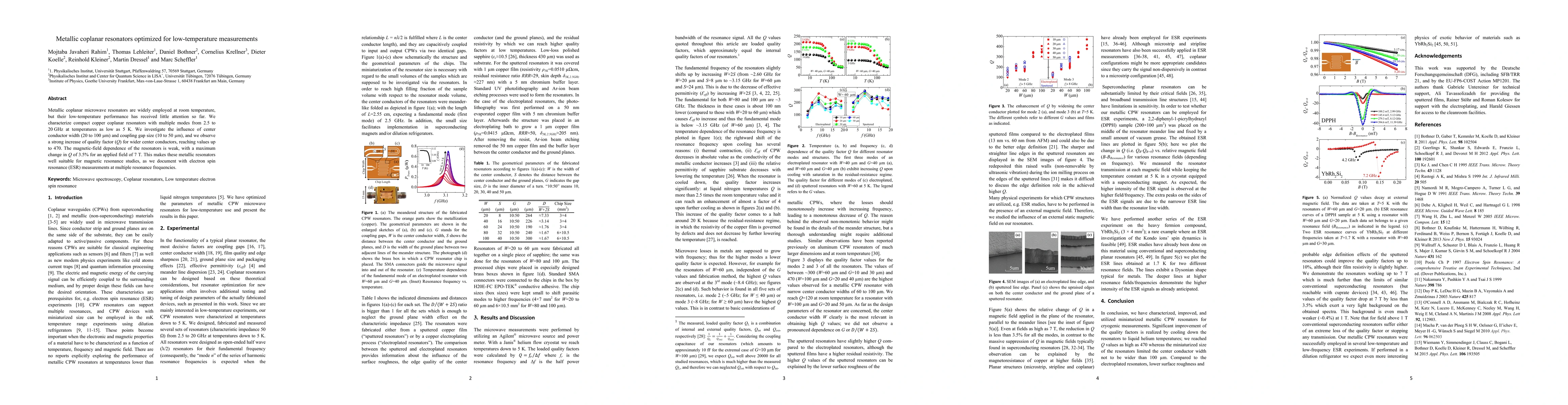 Metallic coplanar microwave resonators are widely employed at room temperature, but their low-temperature performance has received little attention so far. We characterize compact copper coplanar resonators with multiple modes from 2.5 to 20 GHz at temperatures as low as 5 K. We investigate the influence of center conductor width (20 to 100 {\mu}m) and coupling gap size (10 to 50 {\mu}m), and we observe a strong increase of quality factor (Q) for wider center conductors, reaching values up to 470. The magnetic-field dependence of the resonators is weak, with a maximum change in Q of 3.5% for an applied field of 7 T. This makes these metallic resonators well suitable for magnetic resonance studies, as we document with electron spin resonance (ESR) measurements at multiple resonance frequencies.