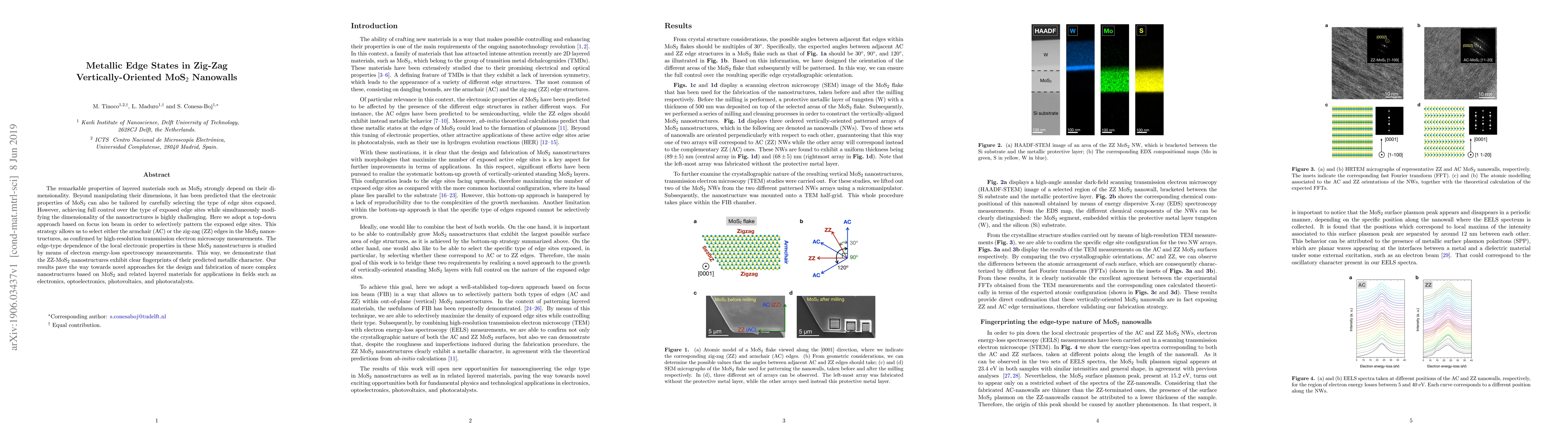 The remarkable properties of layered materials such as MoS2 strongly depend on their dimensionality. Beyond manipulating their dimensions, it has been predicted that the electronic properties of MoS2 can also be tailored by carefully selecting the type of edge sites exposed. However, achieving full control over the type of exposed edge sites while simultaneously modifying the dimensionality of the nanostructures is highly challenging. Here we adopt a topdown approach based on focus ion beam in order to selectively pattern the exposed edge sites. This strategy allows us to select either the armchair (AC) or the zig-zag (ZZ) edges in the MoS2 nanostructures, as confirmed by high-resolution transmission electron microscopy measurements. The edge-type dependence of the local electronic properties in these MoS2 nanostructures is studied by means of electron energy-loss spectroscopy measurements. This way, we demonstrate that the ZZ-MoS2 nanostructures exhibit clear fingerprints of their predicted metallic character. Our results pave the way towards novel approaches for the design and fabrication of more complex nanostructures based on MoS2 and related layered materials for applications in fields such as electronics, optoelectronics, photovoltaics, and photocatalysts.