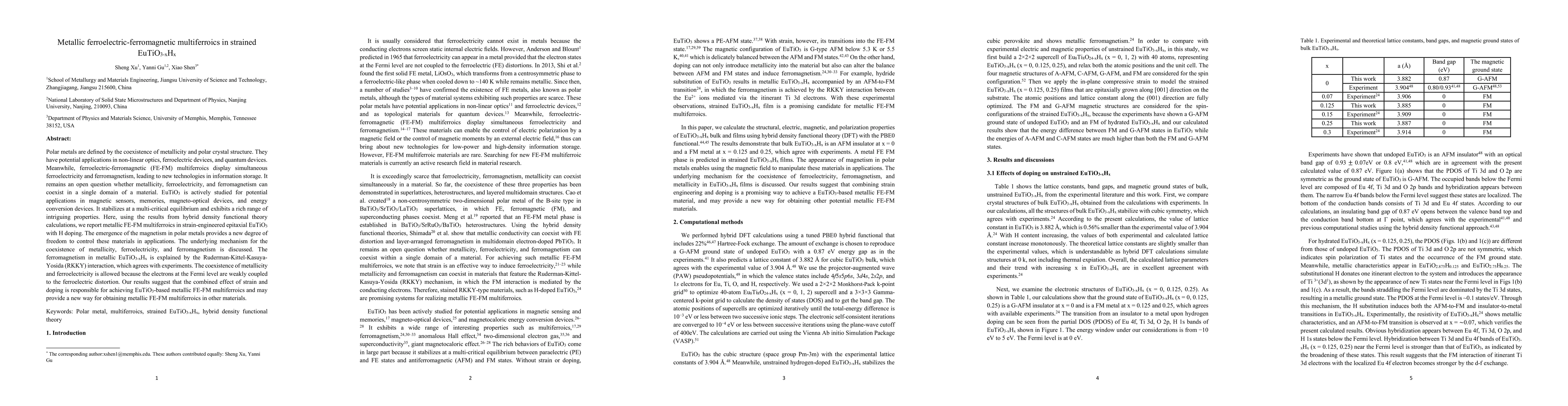 This study reports the existence of metallic ferroelectric-ferromagnetic (FE-FM) multiferroics in strain-engineered, hydrogen-doped EuTiO$_3$ through hybrid density functional theory calculations. The coexistence of metallicity, ferroelectricity, and ferromagnetism is explained by the RKKY interaction and the weak coupling of electrons at the Fermi level to the ferroelectric distortion, suggesting potential applications in advanced magnetic and optical devices.
