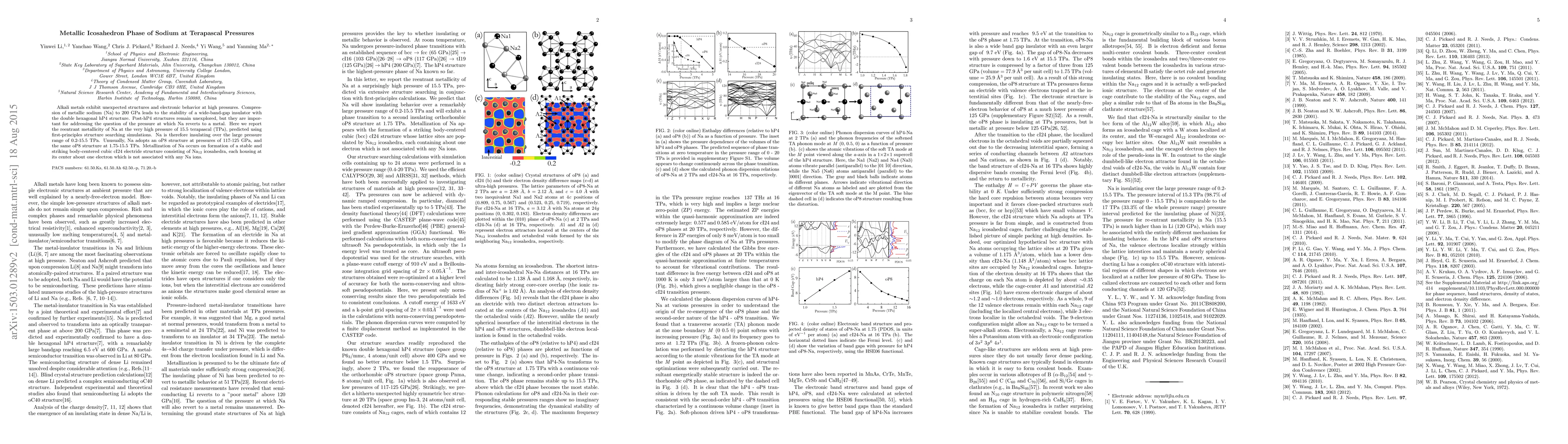 This study reveals that metallic sodium becomes insulating at pressures up to 15.5 TPa, adopting unusual structures including an oP8 phase and a cI24 electride phase with Na12 icosahedra housing free electrons, leading to reentrant metallicity.