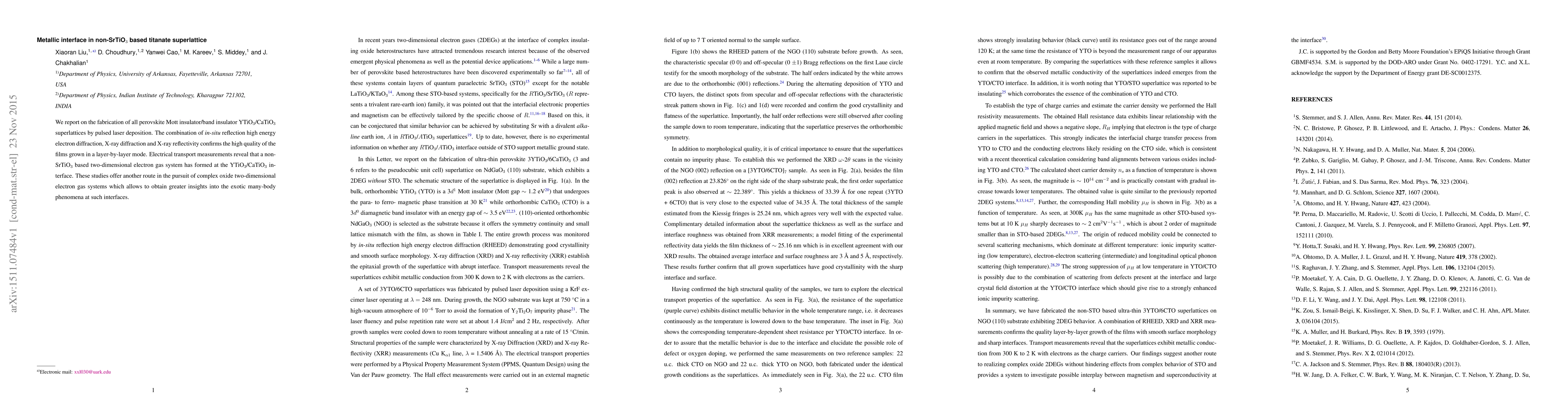 This paper details the fabrication of YTiO3/CaTiO3 superlattices using pulsed laser deposition, revealing a high-quality two-dimensional electron gas system at the interface. The findings provide new insights into complex oxide interfaces and their exotic many-body phenomena.