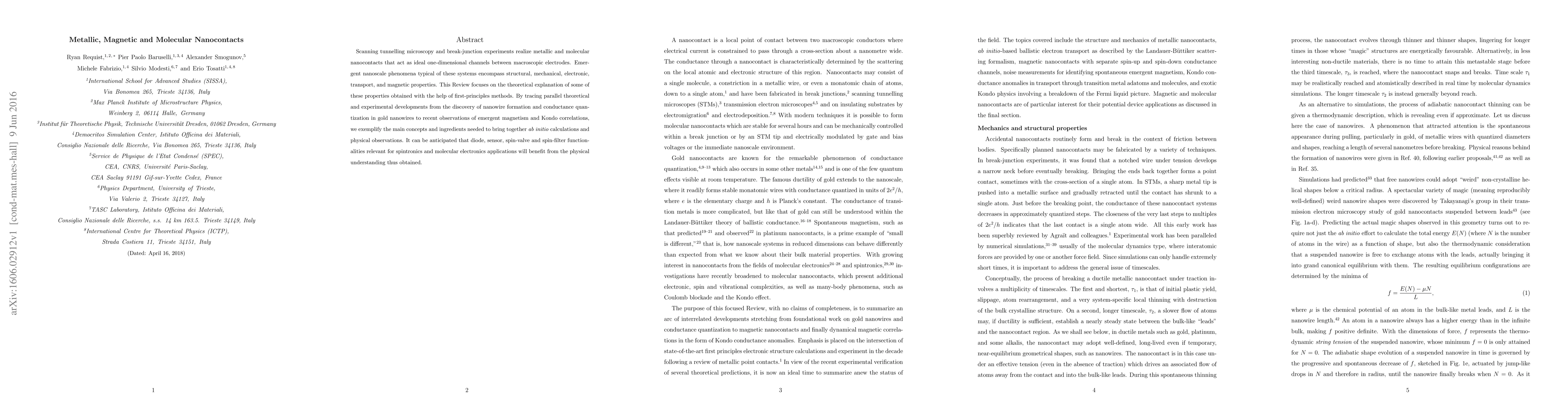 Scanning tunnelling microscopy and break-junction experiments realize metallic and molecular nanocontacts that act as ideal one-dimensional channels between macroscopic electrodes. Emergent nanoscale phenomena typical of these systems encompass structural, mechanical, electronic, transport, and magnetic properties. This Review focuses on the theoretical explanation of some of these properties obtained with the help of first-principles methods. By tracing parallel theoretical and experimental developments from the discovery of nanowire formation and conductance quantization in gold nanowires to recent observations of emergent magnetism and Kondo correlations, we exemplify the main concepts and ingredients needed to bring together ab initio calculations and physical observations. It can be anticipated that diode, sensor, spin-valve and spin-filter functionalities relevant for spintronics and molecular electronics applications will benefit from the physical understanding thus obtained.